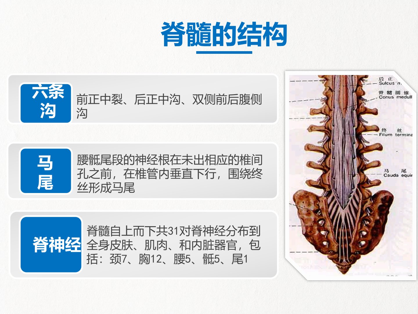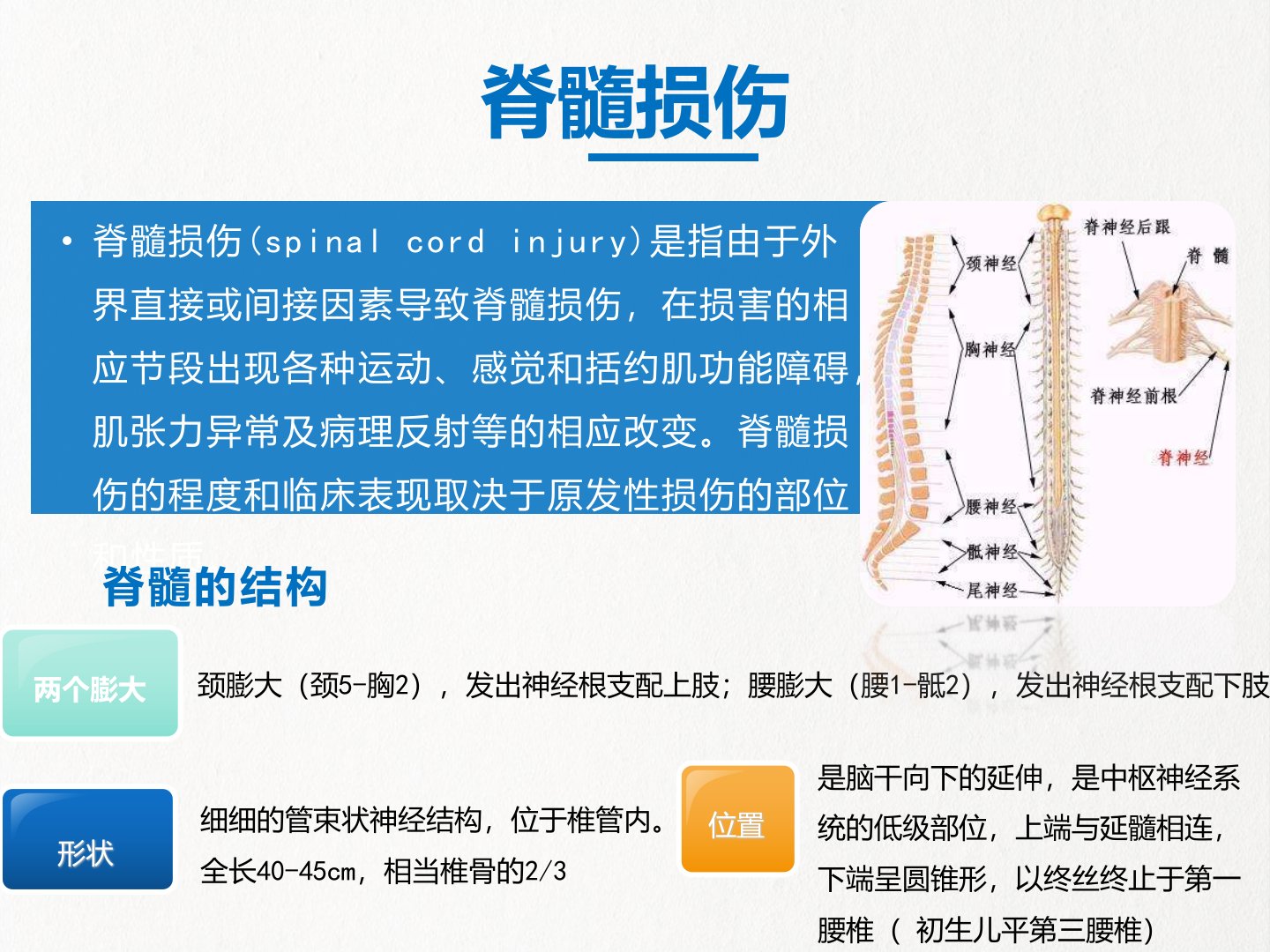 脊髓损伤护理常规摘要脊髓损伤指因外界因素导致脊髓受损出现运动、感觉等功能障碍其程度与临床表现取决于损伤部位与性质。临床特征包括感觉障碍、脊髓休克期反射消失、尿储留、体温调节障碍等。护理问题与措施涵盖呼吸道管理、窒息预防、疼痛护理、颈托护理、牵引护理、术前准备、药物管理、中枢性高热处理、饮食调整、导尿管与引流管护理、并发症观察与处理、心理护理及健康教育等多个方面。护理关键点包括患者神志、生命体征、疼痛、生活方式、心理社会状况、家庭支持、体重营养、既往病史及查体结果等。初始评估关注患者神志、营养、对疾病认知及病情主要症状。持续评估与干预包括体位活动、饮食营养、心理支持、呼吸道管理、牵引护理、药物治疗、疼痛控制、安全护理、颈托护理、中枢性高热处理、中医治疗、个人护理及伤口敷料引流液护理。并发症护理涉及呼吸困难、肺不张、脊髓神经损伤、肺部感染、泌尿系感染、肺栓塞、深静脉血栓形成、下肢挛缩畸形、骨质疏松、压疮及坠床跌倒危险等。康复应早期介入中后期以康复治疗为主目标是预防并发症、减轻残疾、提高生活质量。