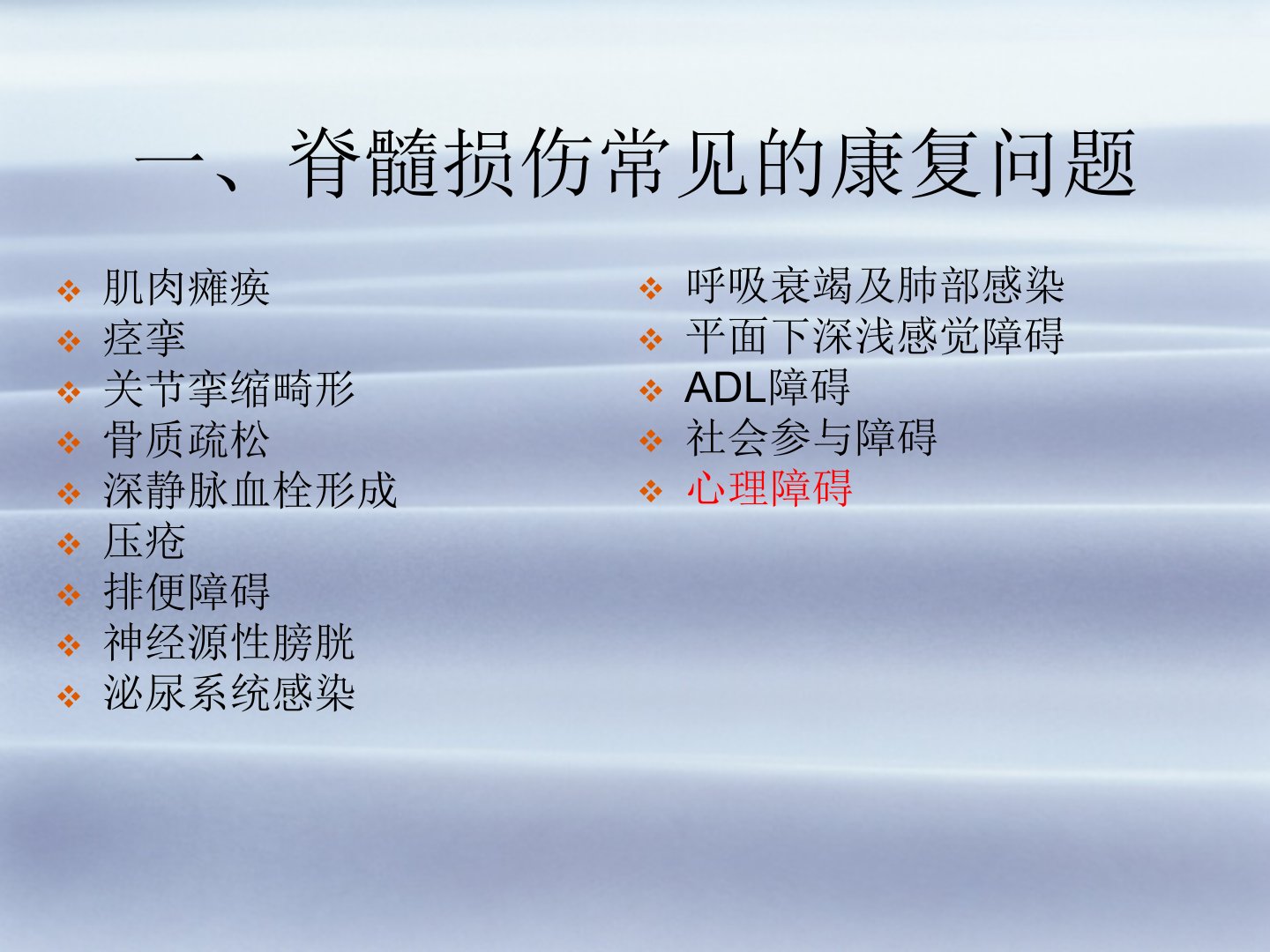 脊髓损伤的心理评定涉及多个方面。心理是人脑对客观世界的主观反应脊髓损伤常导致肌肉瘫痪、痉挛、关节挛缩等多种康复问题以及心理障碍。心理功能评定在康复的初期、中期和终期都非常重要可为制定和修改康复计划提供依据。脊髓损伤后患者心理障碍表现在感知觉、情感和性格方面会出现感知觉部分或完全消失、孤独自卑、倔强自我克制等变化。定性心理评定通过观察和访谈可了解患者经历的震惊、否定、抑郁或焦虑、对抗独立和适应五个心理过程。定量心理评估则采用心理测验量表如艾森格人格问卷、抑郁自评量表等对心理障碍进行定量评价。心理康复治疗包括感觉与知觉康复、心理情绪康复及社会关系协调方法包括支持心理疗法、认知治疗等。对不同阶段的患者应采取不同的心理治疗措施。