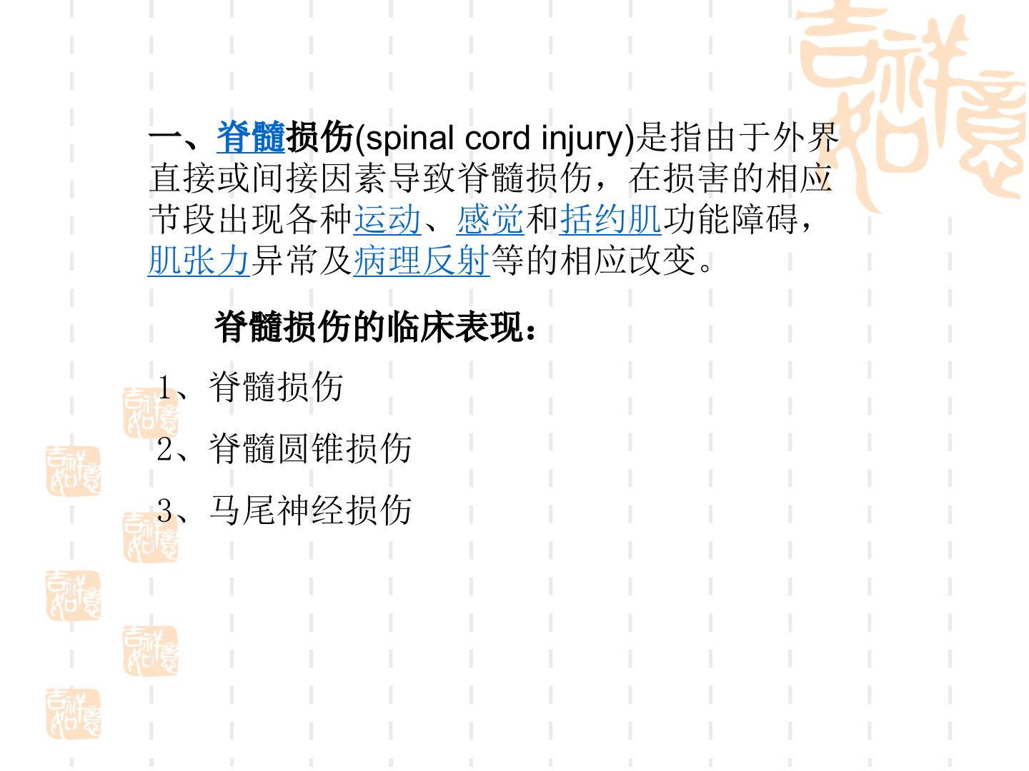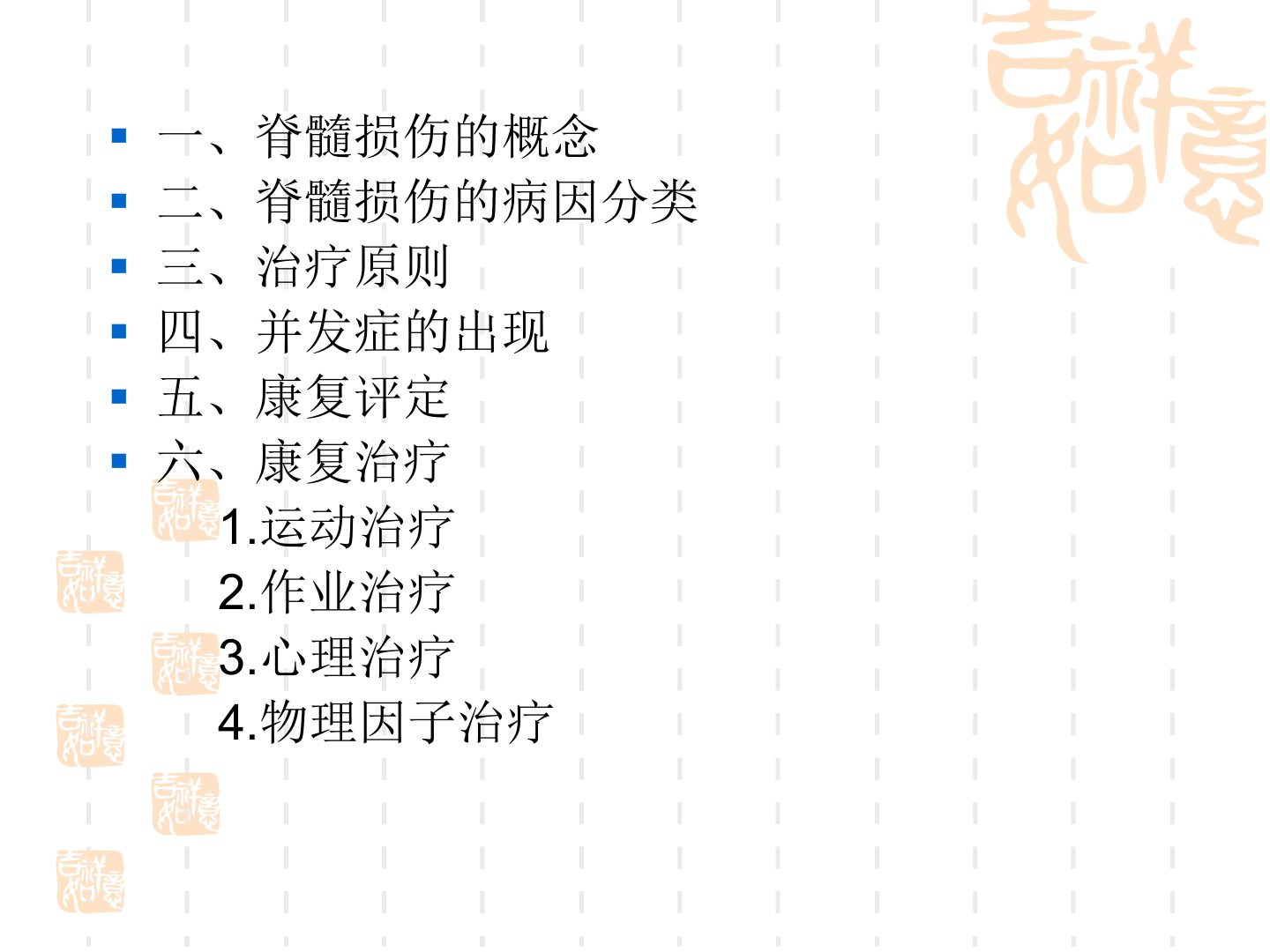 脊髓损伤的康复摘要脊髓损伤指因外界因素致脊髓受损出现运动、感觉等功能障碍。其临床表现多样包括脊髓损伤、脊髓圆锥损伤和马尾神经损伤。病因上分为外伤型和非外伤型解剖上分为四肢瘫和截瘫损伤程度上分为完全性和非完全性损伤。治疗原则为早期手术结合药物抢救并保护残存脊髓功能预防并发症后期通过康复锻炼提高瘫痪肢体功能和生活质量。脊髓损伤并发症多样包括排尿障碍、排粪障碍、压疮等。康复评定涉及感觉、运动关键肌检查、ASIA脊髓功能损害分级等多方面。康复治疗强调早期介入包括保持正确体位、被动活动、关节活动度训练、肌力增强训练、呼吸功能训练、膀胱功能训练等。中后期康复除加强肌力和耐力训练外还包括熟悉轮椅及生活技巧训练如肌力增强、坐起、坐位、转移、站立、步行、轮椅使用及日常生活活动训练等同时配合物理治疗和心理治疗。