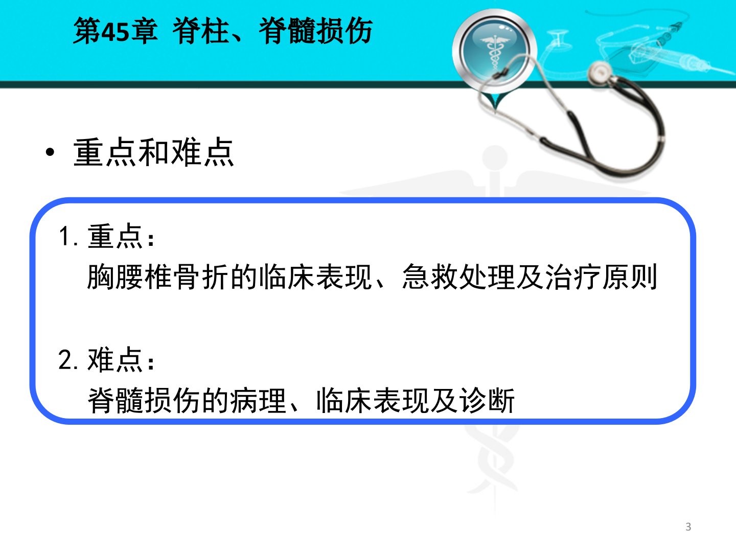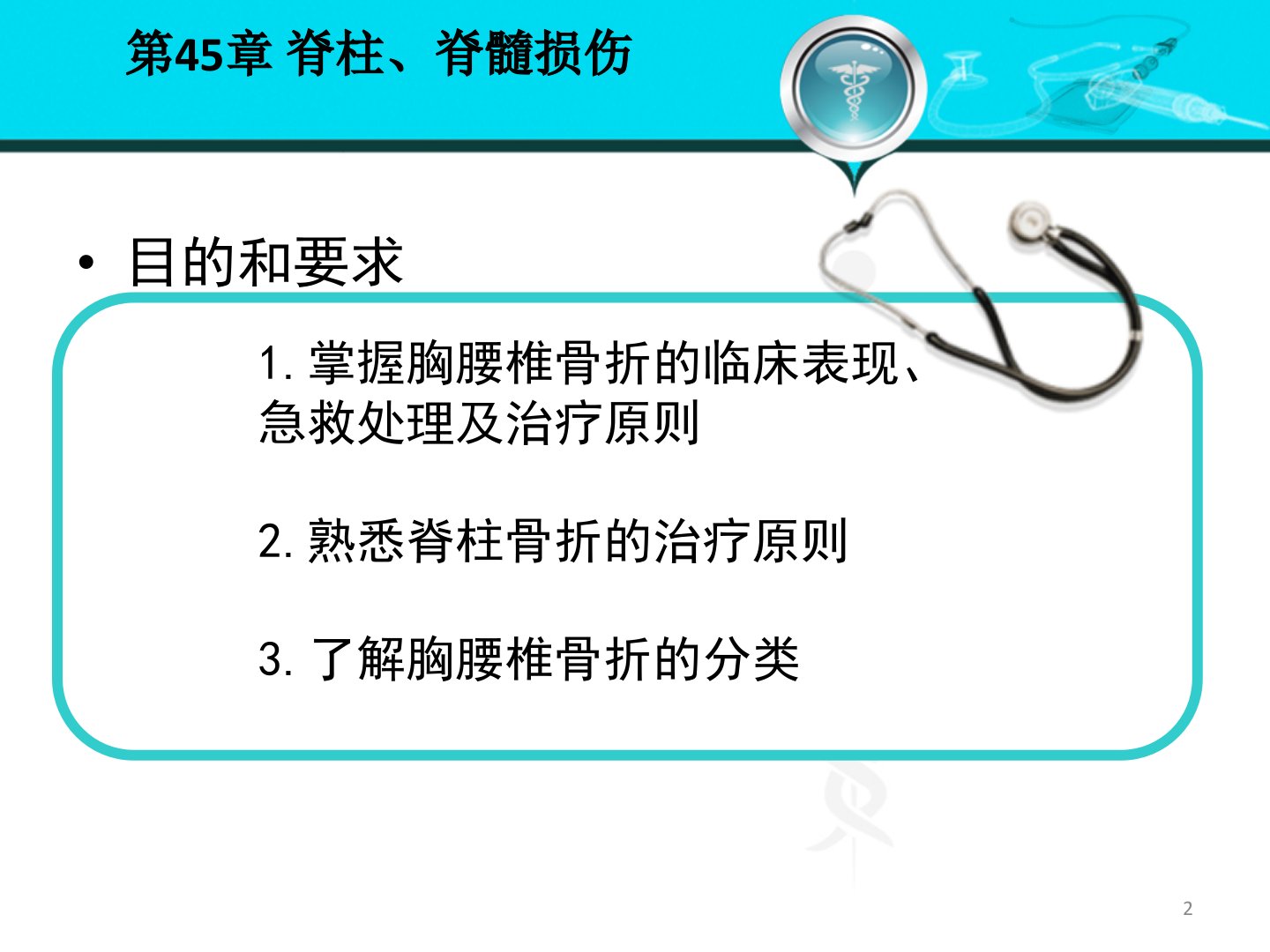 脊柱、脊髓损伤目的和要求1.掌握胸腰椎骨折的临床表现、急救处理及治疗原则2.熟悉脊柱骨折的治疗原则3.了解胸腰椎骨折的分类第45章脊柱、脊髓损伤重点和难点1.重点:胸腰椎骨折的临床表现、急救处理及治疗原则2.难点:脊髓损伤的病理、临床表现及诊断第45章脊柱、脊髓损伤第一节脊柱骨折SpineFracture第45章脊柱、脊髓损伤脊柱骨折(fractureofthespine)十分常见,约占全身骨折的5%~6%,其中胸腰段骨折最多见。脊柱骨折可以并发脊髓或马尾神经损伤,特别是颈椎骨折-脱位合并脊髓损伤可高达70%,严重致残甚至丧失生命。第45章脊柱、脊髓损伤三柱学说(threecolumn)Lou...