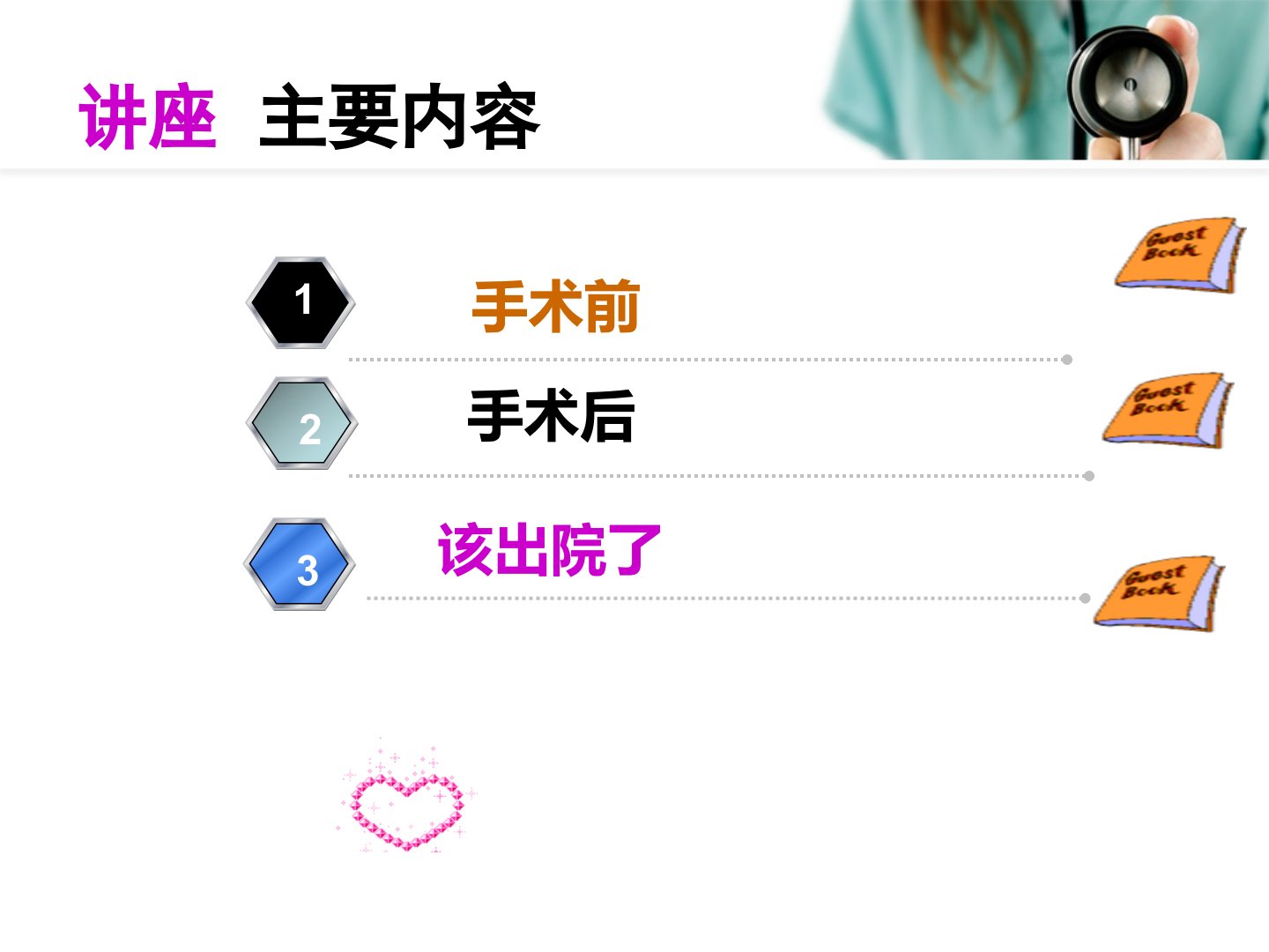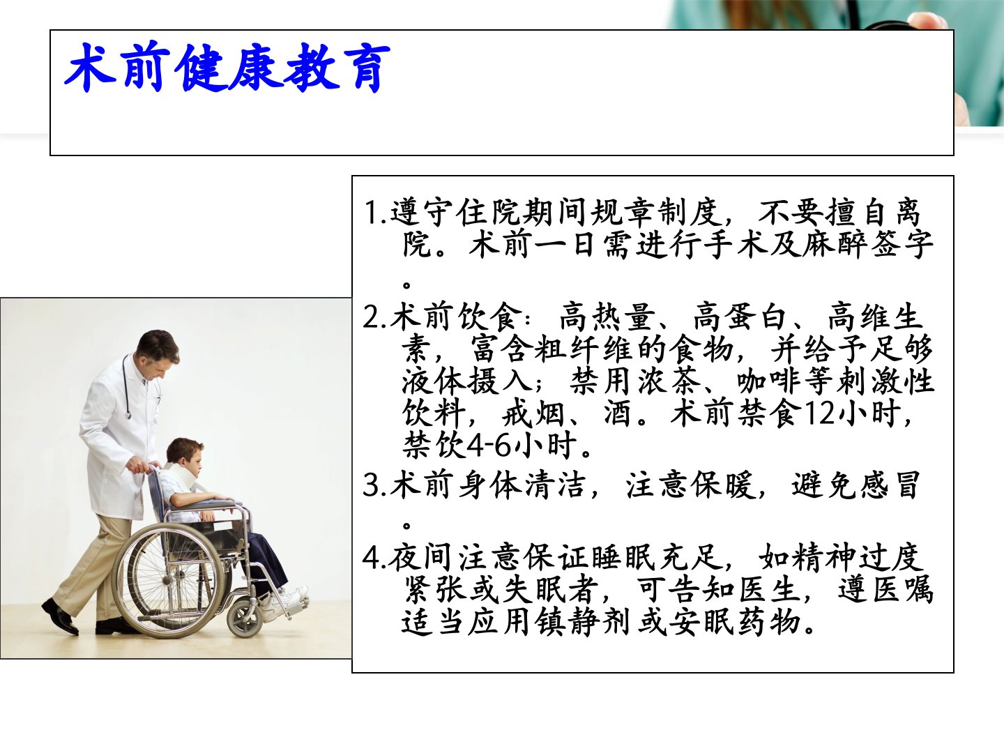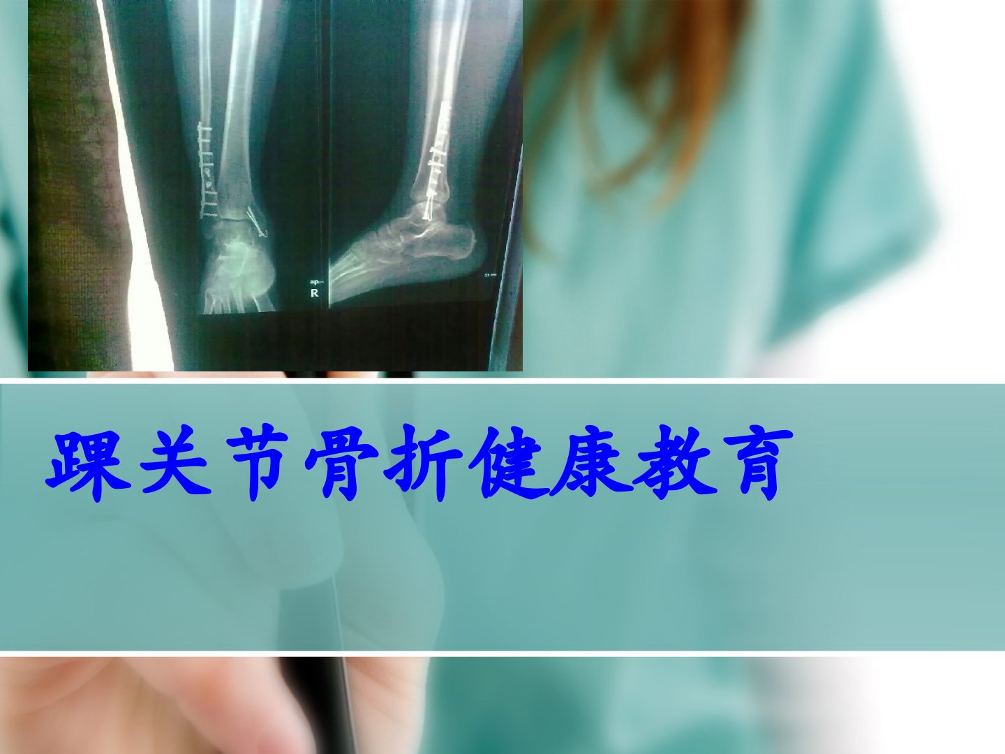 踝关节骨折健康教育讲座主要内容如下:术前:遵守住院规章制度术前一日完成手术及麻醉签字;饮食方面选择高热量、高蛋白、高维生素食物禁刺激性饮料戒烟酒并禁食禁饮;注意身体清洁保证睡眠精神紧张或失眠者可遵医嘱用药;术日晨需排空二便去除饰品更换手术衣;腕带是手术时识别病人的重要依据应妥善佩戴。术后:根据麻醉方式选择卧位保持切口敷料清洁;保持镇痛泵通畅疼痛难忍则按压按钮;抬高患肢减轻水肿;饮食选择营养丰富、易消化的流质或半流质食物逐渐过渡到普食;麻醉作用消失后即可进行患肢功能锻炼;防止坠床;术后1周左右根据具体情况可借助器械下地初次下床活动时必须有医护人员陪伴。出院:保持心情舒畅注意休息适当锻炼;均衡饮食戒烟酒忌辛辣补充钙质;按时服药伤口保持干燥观察无异常后拆线;继续功能锻炼预防并发症;出院后随访中心会电话随访如有不适及时就诊;填写意见征求调查表;结账时携带好押金收据如需复印病历请于出院7日后办理。