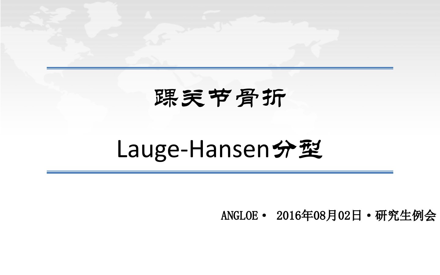 2016年研究生例会聚焦踝关节骨折LaugeHansen分型。踝关节骨性结构包括胫骨、腓骨远端和距骨其韧带结构有内侧、外侧副韧带等。踝关节骨折时局部肿胀、压痛和功能障碍是主要表现。诊断时需结合外伤史、临床症状及X线片因为不同暴力方向导致的相同骨折整复和固定方法不同。踝关节的X光片是必须的诊断依据其中距骨角变化、内外踝关节面间隙等都是重要的诊断指标。LaugeHansen分型是经典分型方法由丹麦学者LaugeHansen于1950年提出它基于受伤时足的位置和暴力方向将损伤机制和骨折类型结合对韧带损伤程度和手术方式选择有重要指导价值。该分型最初分为旋后外旋型、旋后内收型、旋前外旋型、旋前外展型四型每型又分不同度数详细描述了骨折和韧带损伤情况。