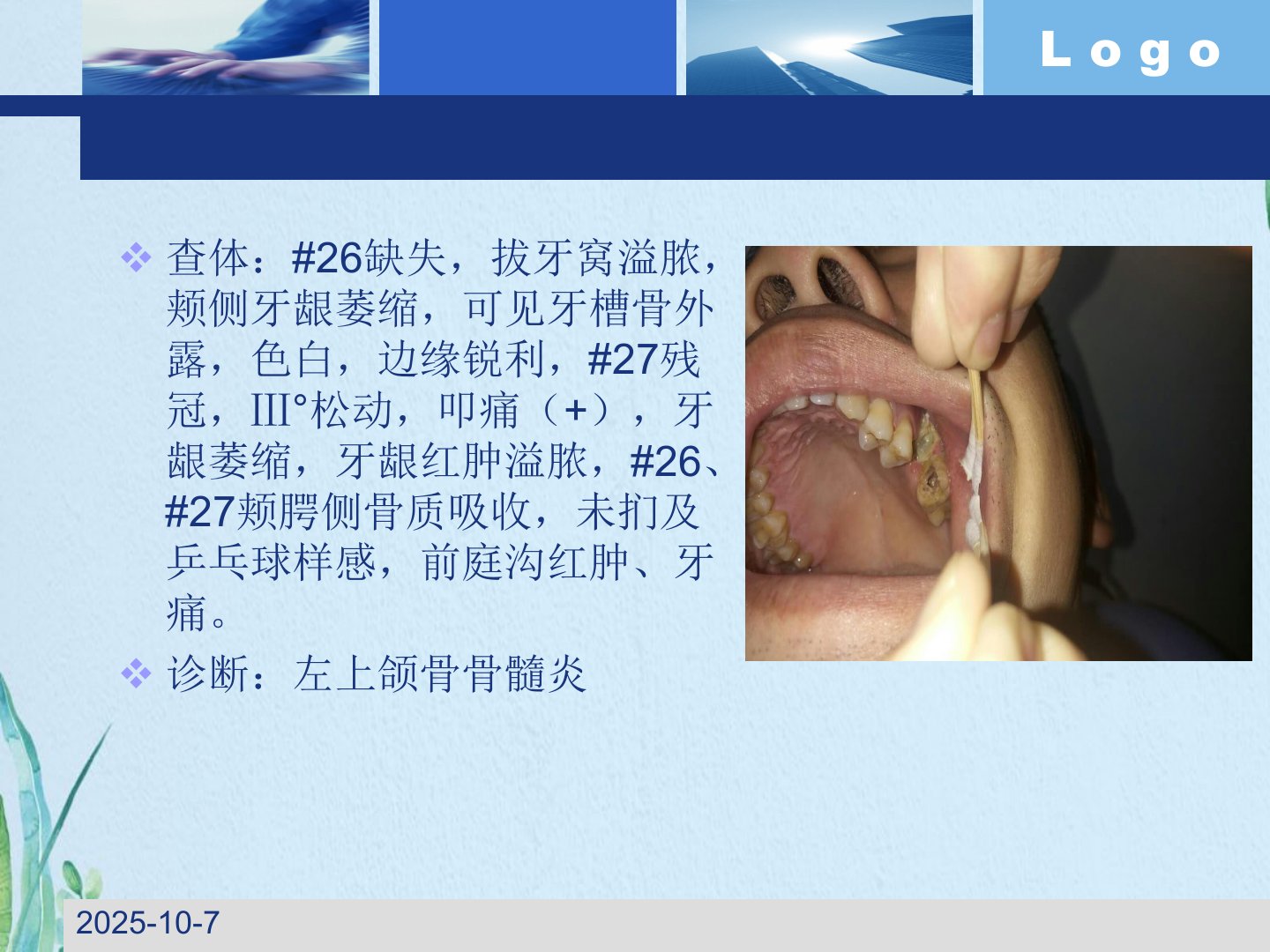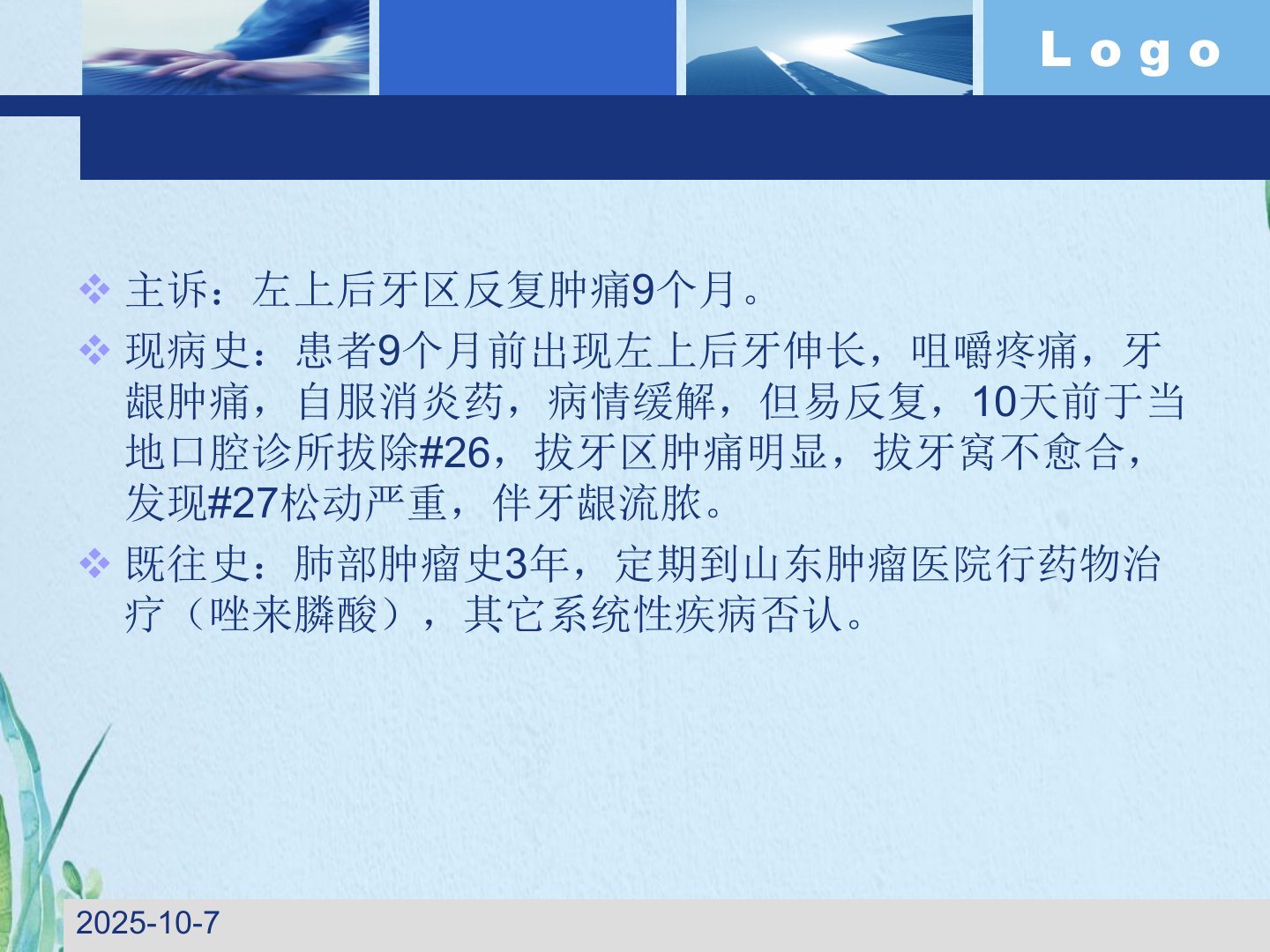 Logo病例讨论摘要患者主诉左上后牙区反复肿痛9个月9个月前出现咀嚼疼痛、牙龈肿痛自服消炎药后病情反复。10天前拔除26牙后肿痛明显拔牙窝不愈合27牙松动伴牙龈流脓。患者有3年肺部肿瘤史长期用唑来膦酸治疗。查体见26缺失拔牙窝溢脓27残冠松动26、27颊腭侧骨质吸收。诊断为左上颌骨骨髓炎分类为双磷酸盐相关性颌骨坏死。双膦酸盐类药物用于预防治疗骨质疏松、恶性肿瘤骨转移等大致分为3代唑来膦酸作用最强。其不良反应包括抑制牙齿萌出、改变形态及导致颌骨坏死。BRONJ临床可分5期诊断主要依赖临床表现。治疗建议停用双膦酸盐采取保守性清创、控制感染等措施。最新研究显示干细胞治疗可能成为安全有效治疗BRONJ的方式。