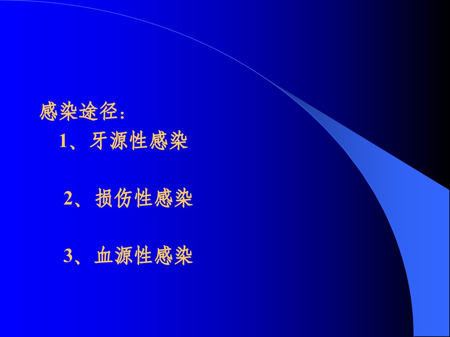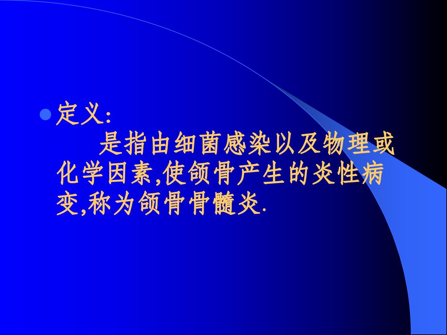 颌骨骨髓炎是由细菌感染及物理化学因素导致的颌骨炎性病变感染途径包括牙源性、损伤性及血源性。急性期局部表现为牙痛剧烈、牙松动、牙龈溢脓、开口困难等全身症状有寒战、高热、白细胞升高、食欲减退等血行传播可致败血症。慢性期局部会形成瘘孔、炎性肉芽增生、长期排脓、排出死骨片甚至发生病理性骨折;全身症状为体温正常或低热、疼痛减轻。颌骨骨髓炎分边缘性骨髓炎(增生型骨膜反应活跃溶解破坏型骨膜被破坏形成脓肿)和中央型骨髓炎(感染来源以龋病继发病等为主破坏骨髓后形成骨膜下脓肿等)边缘型骨髓炎以下颌智齿冠周炎为主破坏密质骨。该病需与急性冠周炎、根尖脓肿、肿瘤鉴别。治疗上急性颌骨骨髓炎采用药物和外科治疗如拔牙、切开去骨;慢性颌骨骨髓炎必须手术去除死骨和病灶中央型摘除死骨边缘型刮除死骨。