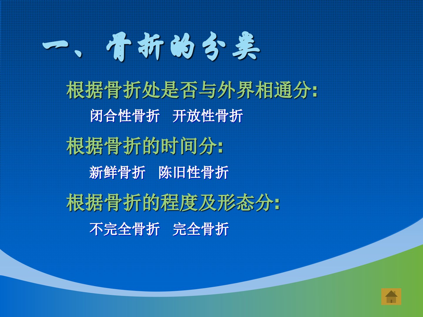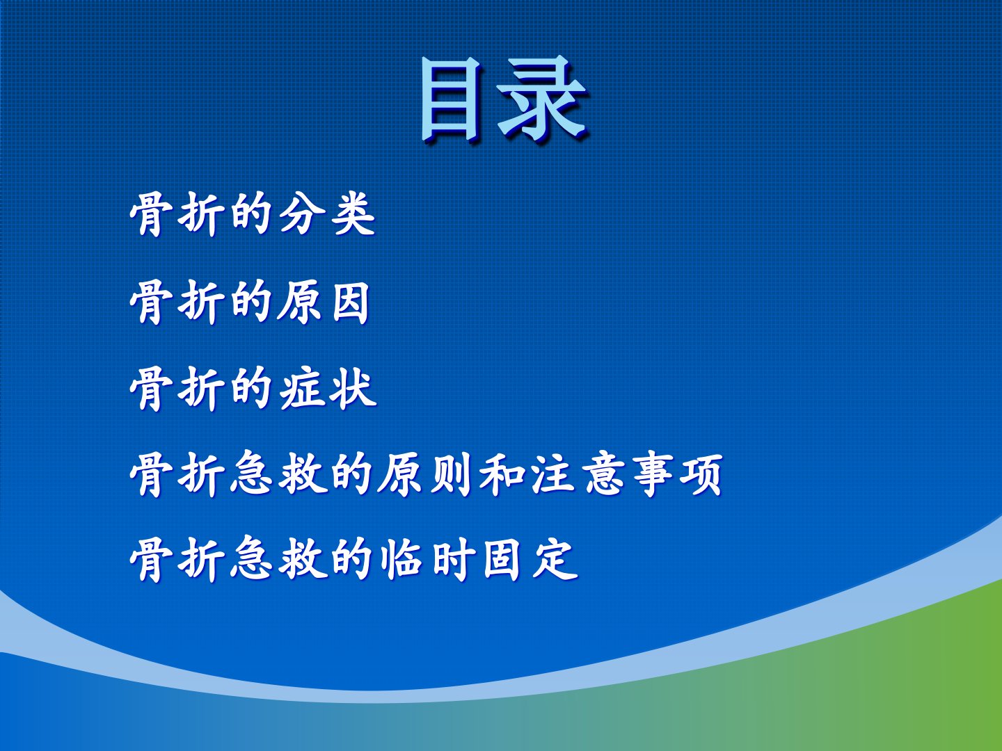 摘要如下:本文目录涵盖骨折的分类、原因、症状、急救原则及临时固定方法。骨折分类包括闭合性与开放性、新鲜与陈旧性、不完全与完全骨折。原因有直接暴力、积累性劳损、间接暴力及肌肉牵拉力。症状方面有全身表现如休克、体温异常以及局部表现如疼痛、肿胀、畸形等X线可确诊。急救原则强调救命在先防止休克就地固定先止血再包扎。临时固定方法包括锁骨骨折用三角巾固定肱骨干及前臂骨折用夹板及悬臂带固定手腕部、股骨、小腿骨折也有相应固定法。此外还介绍了颈椎、胸腰椎骨折搬运注意事项强调保持患者身体平稳避免加重损伤。课后思考涉及意外伤害时骨折的判断与急救措施以及高空坠落时可能发生的骨折类型及注意事项。