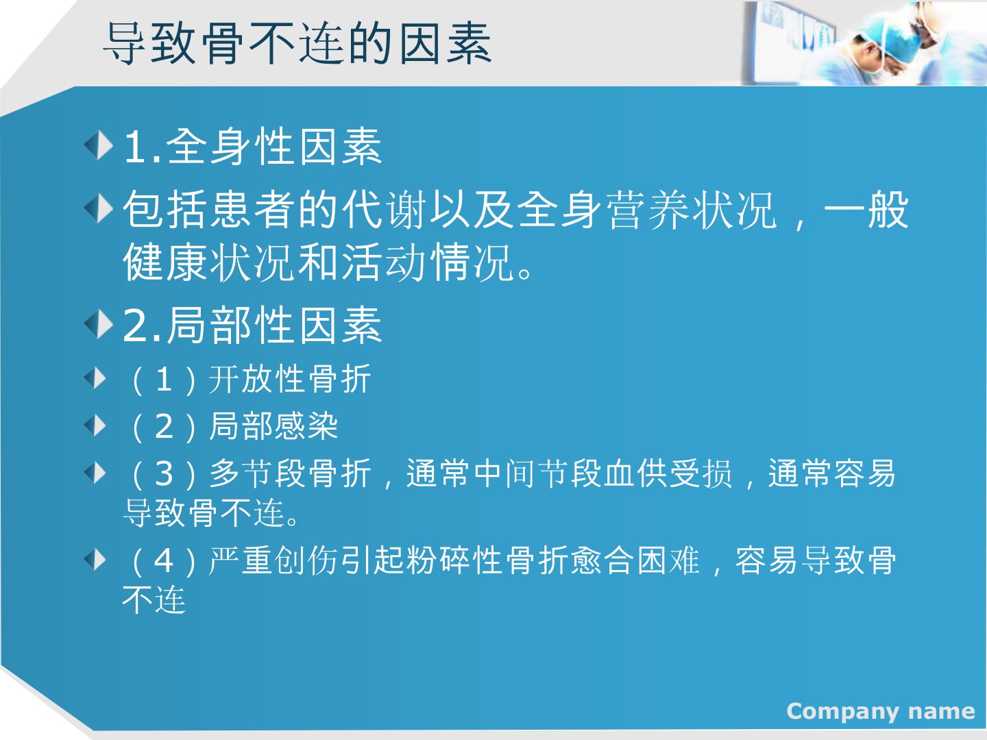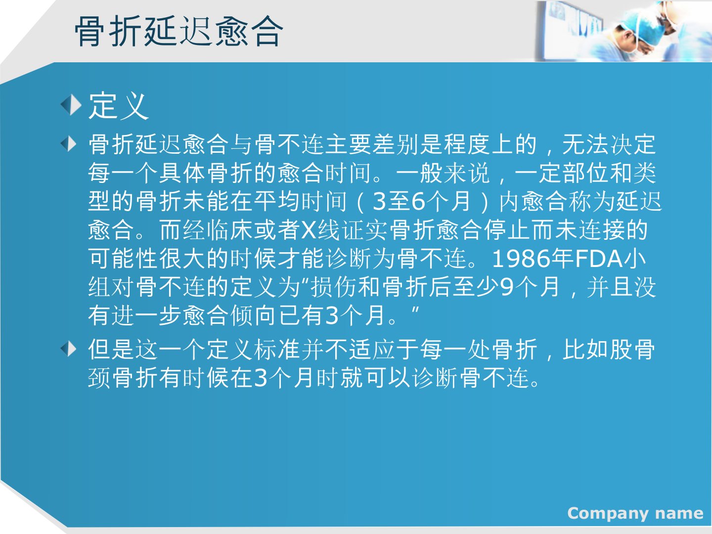 骨折延迟愈合指一定部位和类型的骨折未能在平均时间(3至6个月)内愈合而骨不连则是经临床或X线证实骨折愈合停止且连接可能性低。1986年FDA将骨不连定义为损伤和骨折后至少9个月无愈合倾向已有3个月但该定义并不适用于所有骨折。导致骨不连的因素包括全身性因素(如代谢、营养状况)和局部性因素(如开放性骨折、感染、多节段骨折、固定不牢固等)。治疗前需评估软组织(瘢痕组织、血管状况、神经损伤)和骨的状况(骨不连分类:肥大性、萎缩性)。治疗原则包括骨折复位、植骨(材料包括自体松质骨、同种异体骨等方式有覆盖植骨术、双侧覆盖植骨术等)、稳定骨折端(钢板螺钉内固定、髓内钉固定、外固定)、低强度超声刺激、电和电磁刺激骨生长等。