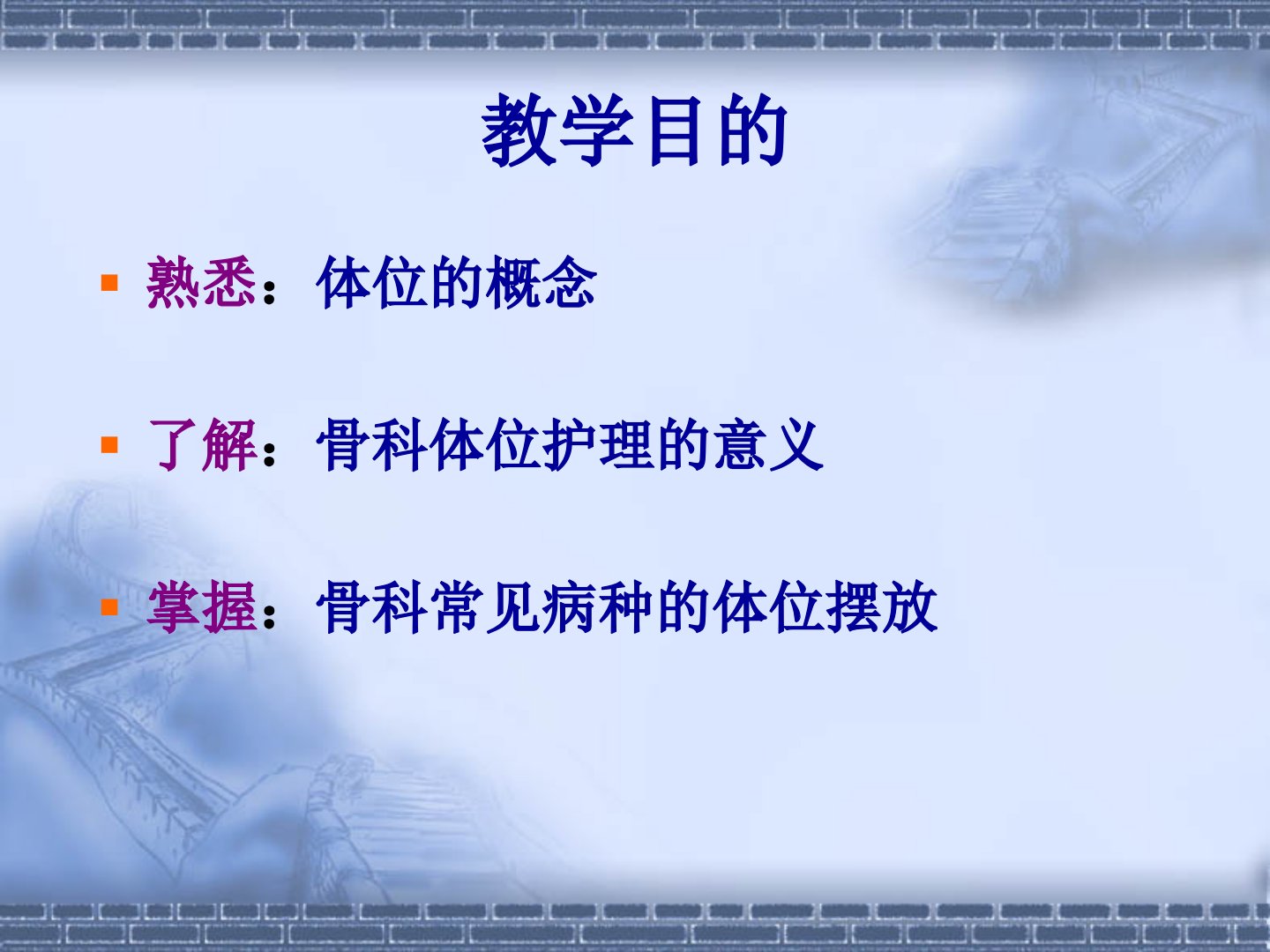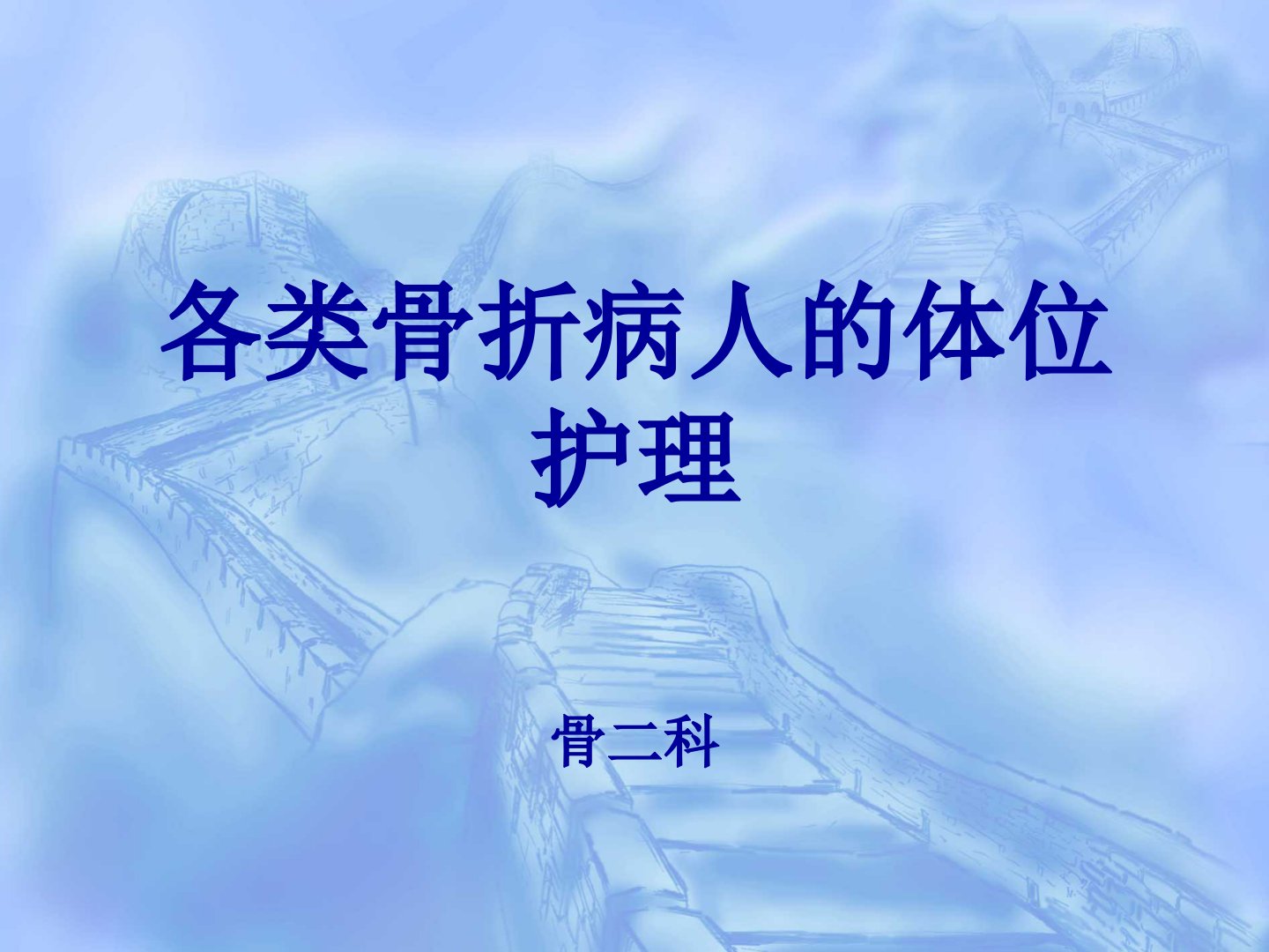 各类骨折病人的体位护理摘要本次骨二科教学目的为熟悉体位概念了解骨科体位护理意义掌握常见病种体位摆放。体位在临床上指根据治疗等需要保持的身体姿势。正确安置骨折病人体位利于功能恢复避免不良后果尤其对牵引等病人要保持关节功能位。大骨科常见骨折中脊柱骨折要重点观察病人呼吸等情况颈椎骨折保持头颈中立位等胸腰椎骨折以平卧硬板床为主;胸部外伤合并胸椎骨折病人平稳时可告知轴线翻身方法疼痛难忍则抬臀或轻度侧卧。颈椎损伤患者平卧时头颈部制动改侧卧位需三人操作侧卧改平卧位也有相应规范。肋骨骨折重点观察意识等情况采取半卧位等。骨盆骨折稳定性骨折取仰卧或健侧卧位多发或不稳定性骨折尽量减少搬动牵引治疗有体位要求。四肢骨折重点观察肢体等情况抬高患肢不同骨折类型有不同体位要求外固定治疗患者要注意外固定器具是否稳妥牵引治疗、石膏或小夹板固定患者也各有注意事项。翻身或搬动时要提前评估准备保持骨折部位稳定结合患者情况采取技巧之后检查体位。