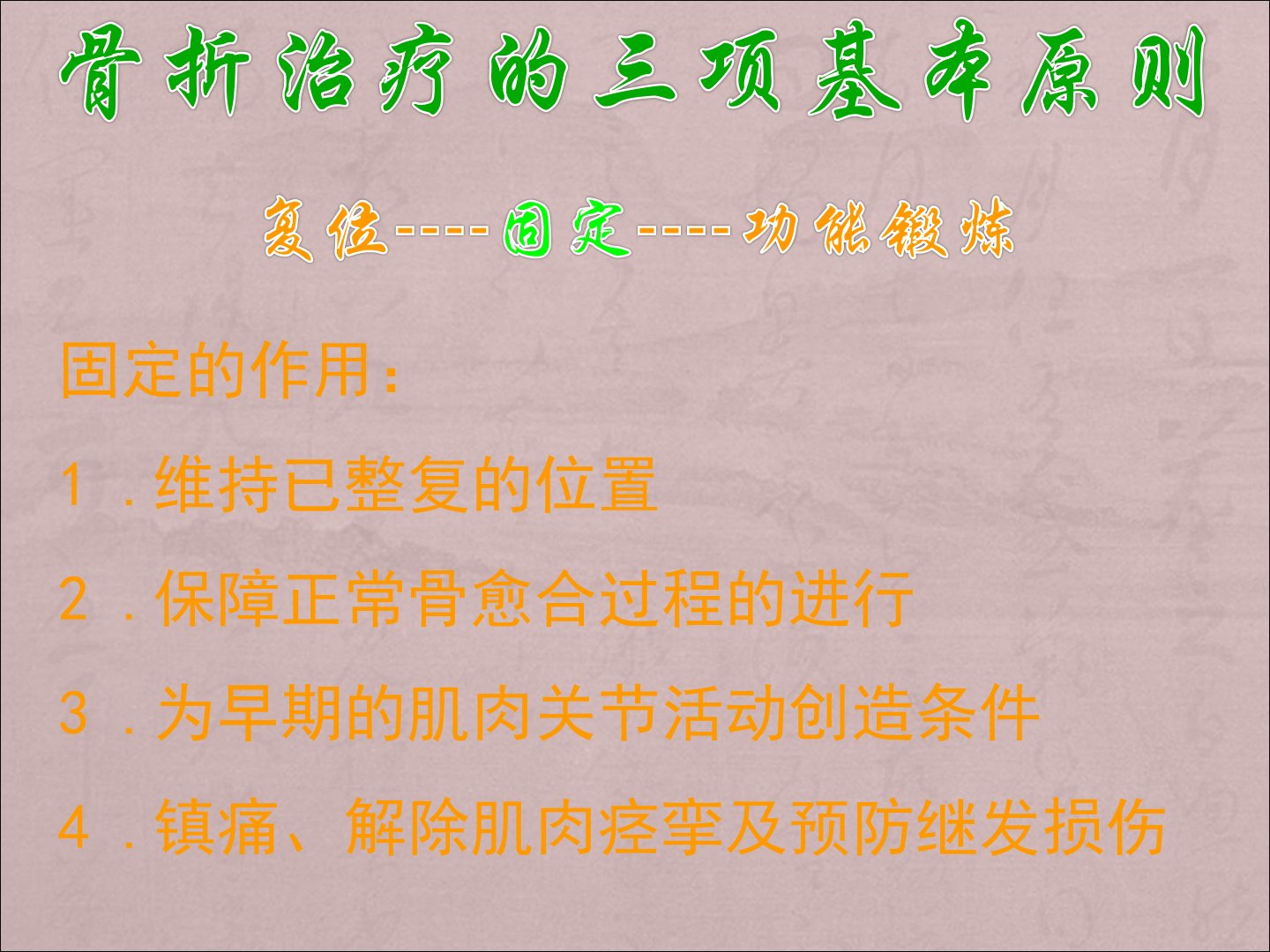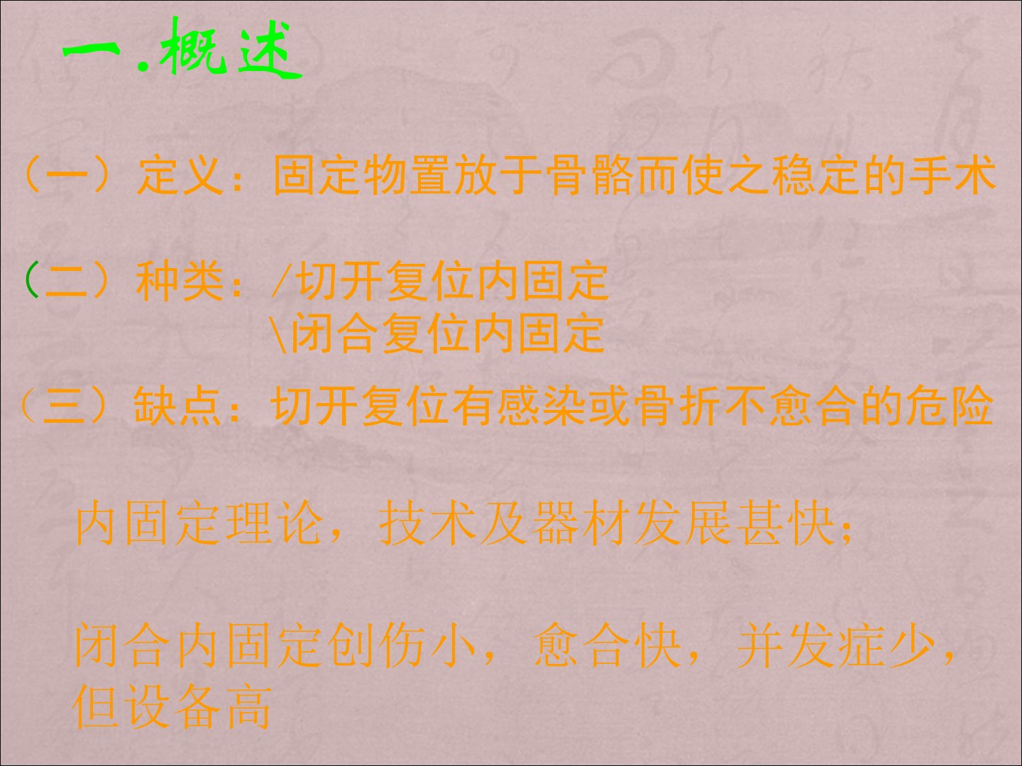 骨折内固定术是骨折治疗的重要手段旨在通过固定物维持整复位置保障骨愈合为早期活动创造条件。固定方式包括切开复位内固定和闭合复位内固定后者创伤小、愈合快但设备要求高。内固定适应症广泛包括有利于骨折愈合、简化治疗、修复并发损伤、减少后遗症及早期离床活动等情况。内固定材料要求抗酸碱、无磁性、高强度且不易老化常用材料有铬镍不锈钢、钴基合金、钛基合金等。常用内固定物包括接骨板、螺丝钉和不锈钢丝各有其种类、用途和要求。钢板内固定术适应症包括长骨干新鲜骨折、畸形愈合矫正等禁忌症为儿童及青少年。髓内针固定术通过摩擦力控制骨折端旋转及剪力适应症包括股骨骨折等。开放性髓内钉内固定术有优点也有缺点手术时需注意防止卡针、断端分离等问题。AO理论与技术强调解剖复位、坚强内固定和早期功能锻炼但存在应力遮挡等弊端。BO生物学固定则更重视骨及软组织血运保护提倡间接复位和生物学钢板应用。