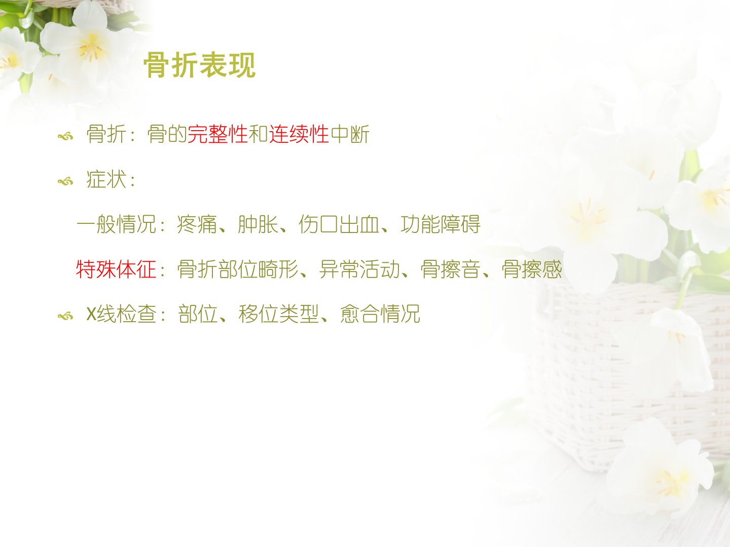 摘要骨折指骨的完整性和连续性中断症状包括疼痛、肿胀等一般情况以及畸形、异常活动等特殊体征X线检查可明确部位、移位类型和愈合情况。骨折愈合经历出血发炎、修复改建等时期分为纤维骨痂期、骨性骨痂期、临床愈合期和骨性愈合期。骨折可根据原因、程度、是否与外界相通、骨折端稳定程度进行分类。骨折并发症包括早期休克、脂肪栓塞综合症等和晚期压疮、下肢静脉血栓等。骨折临床愈合标准包括局部无压痛、无异常活动等。临床治疗原则包括复位固定和功能锻炼复位注意事项包括早期、有效、无痛及少创复位。影响骨折愈合的因素包括全身因素和局部因素。康复评定主要考虑主观检查、物理检查等康复治疗作用包括促进肿胀消退、防止关节挛缩等。康复治疗原则需考虑患者情况制定康复计划康复治疗方法包括急性期消肿、防止肌肉萎缩以及亚急性期及慢性期恢复关节活动范围和肌力。