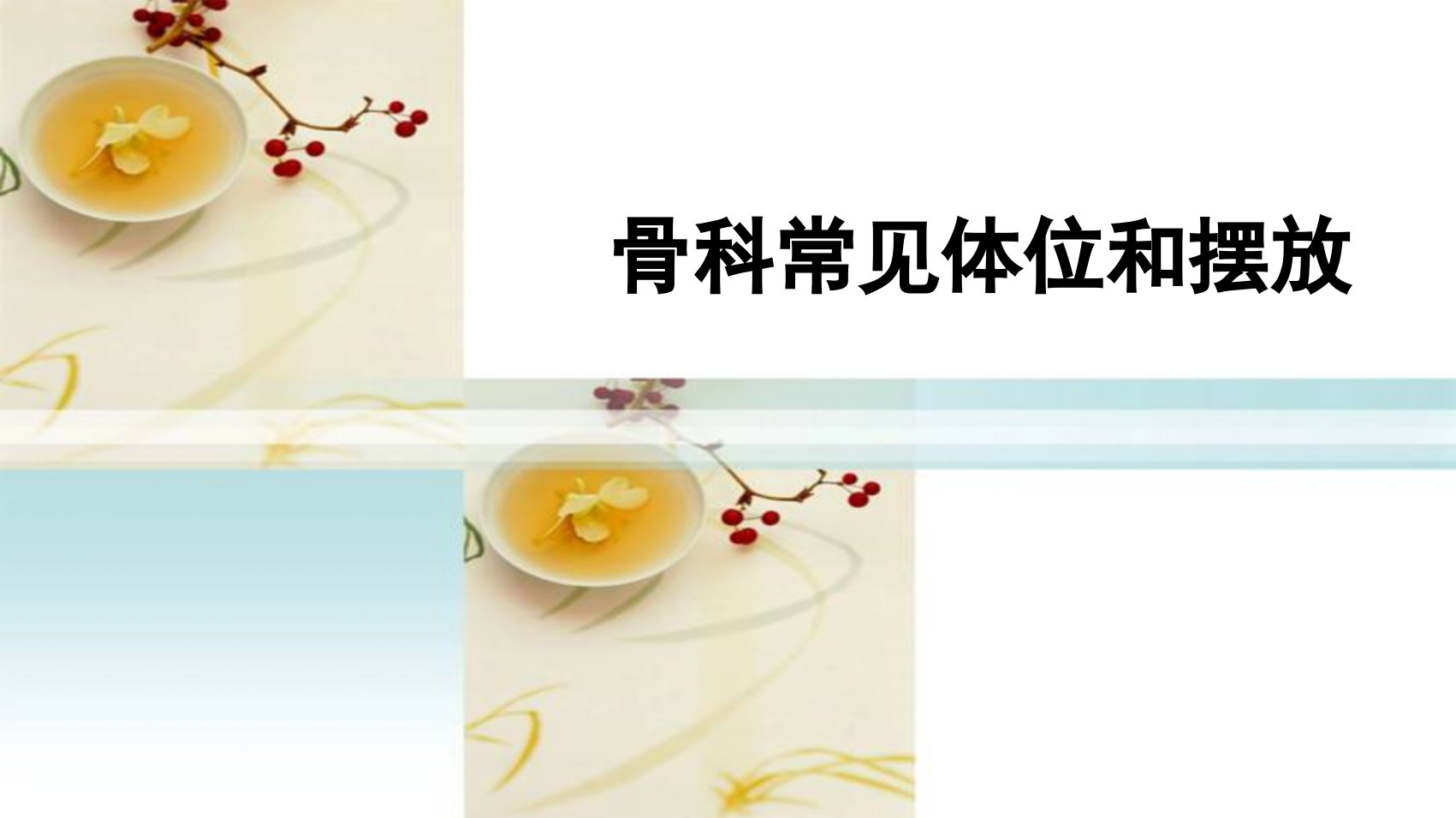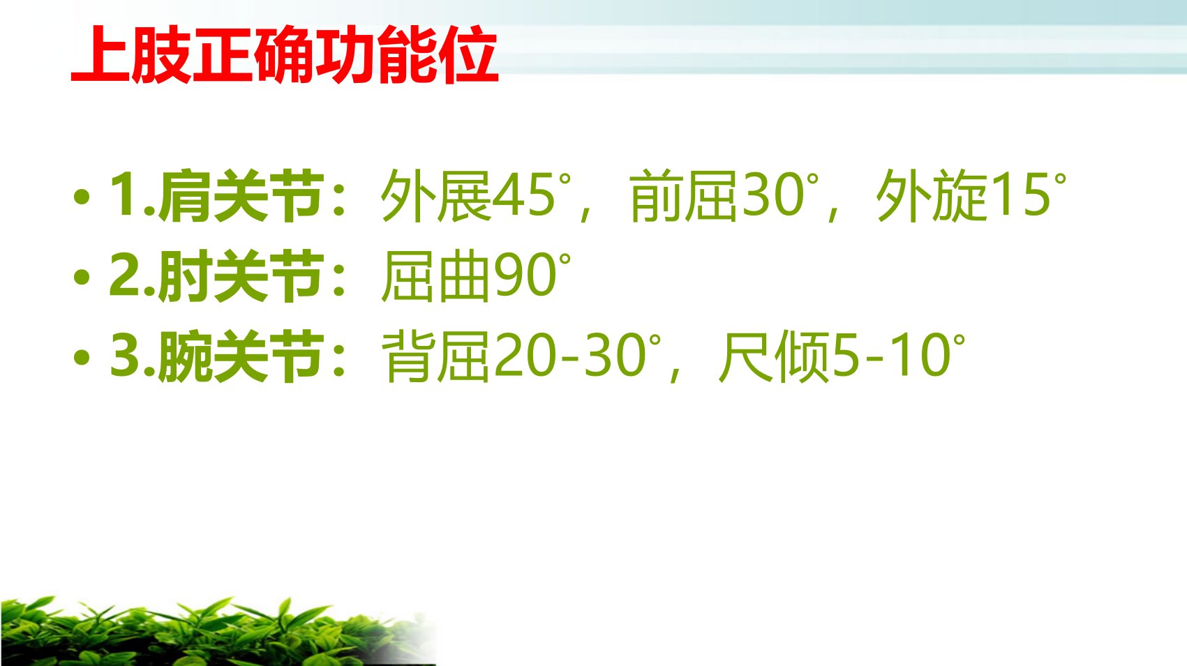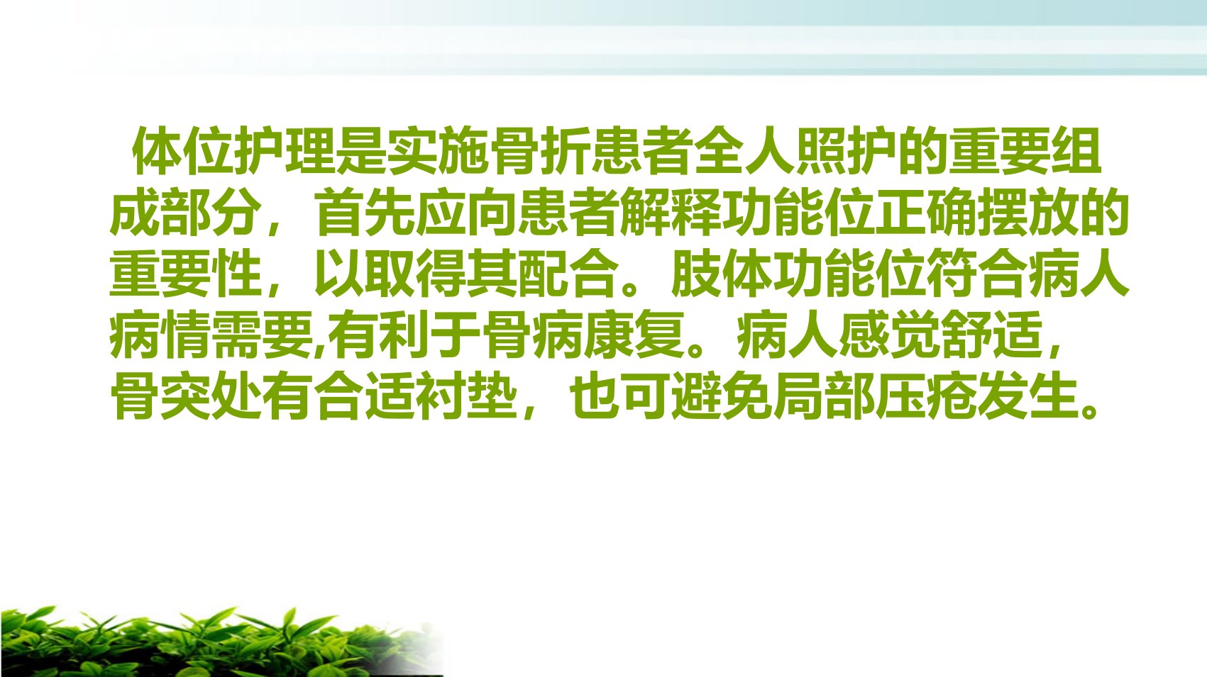 骨科常见体位和摆放体位护理是骨折患者全人照护的重要部分。需先向患者解释功能位摆放的重要性。正确功能位符合病情需要利于康复能让病人舒适避免压疮。上肢功能位:肩关节外展45前屈30外旋15肘关节屈曲90腕关节背屈2030尺倾510。下肢功能位:髋关节前屈1520外展1020外旋510膝关节屈曲5或伸直180踝关节背屈90。不同部位骨折还有特定要求如锁骨骨折有仰卧、半卧等不同体位要求;肱骨骨折术后可抬高床头患肢用软枕抬高;桡骨远端骨折要防止前臂旋转;手部骨折要注意手部功能位;颈椎骨折要防止错位;胸腰椎骨折要维持腰部正常生理曲度;骨盆骨折可膝下放软枕;股骨颈等骨折下肢保持外展中立位;胫骨平台等骨折有相应体位要求;全髋关节置换术、外固定支架术、牵引术后、石膏固定术后也都有特定的体位护理要求。