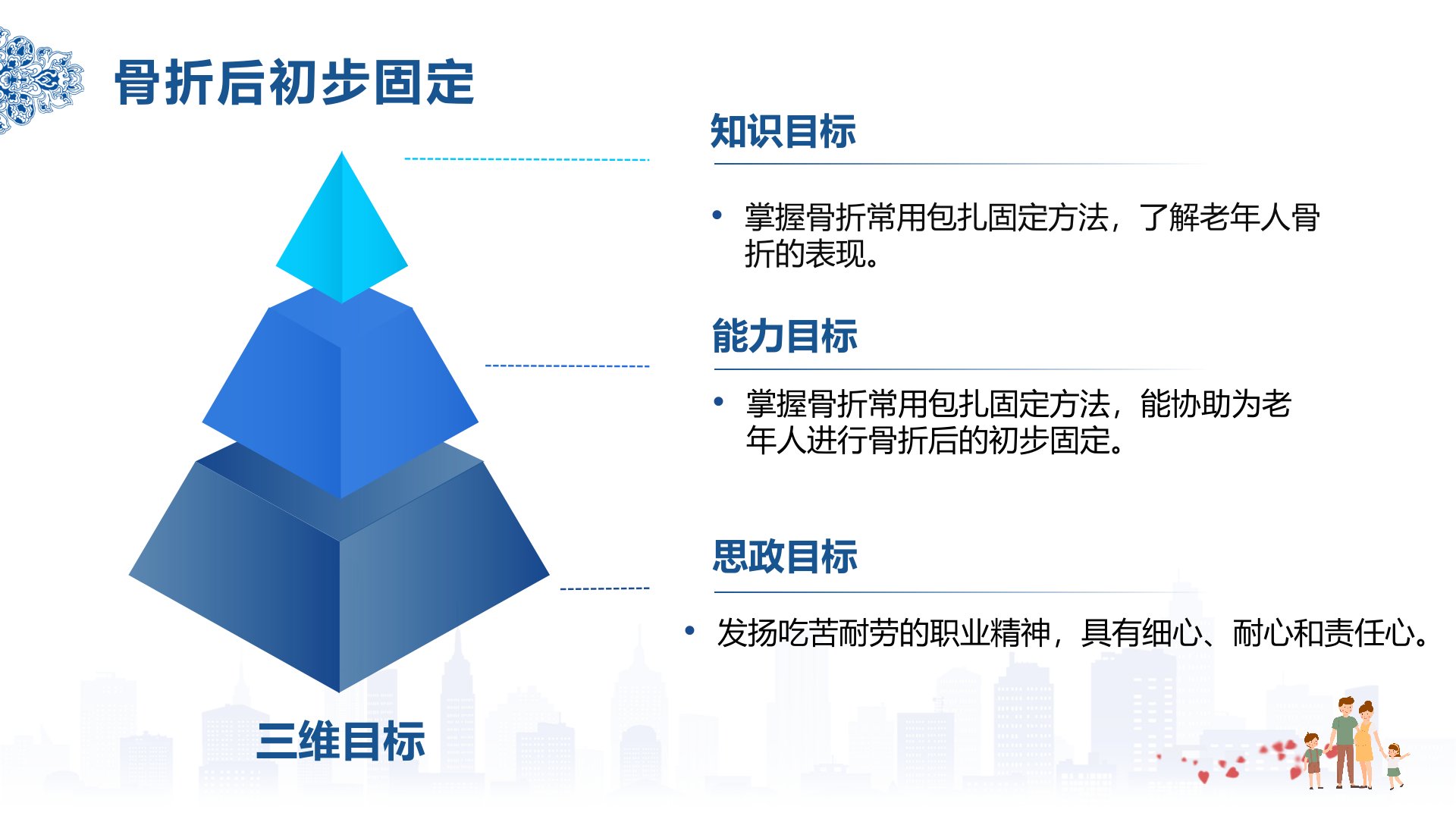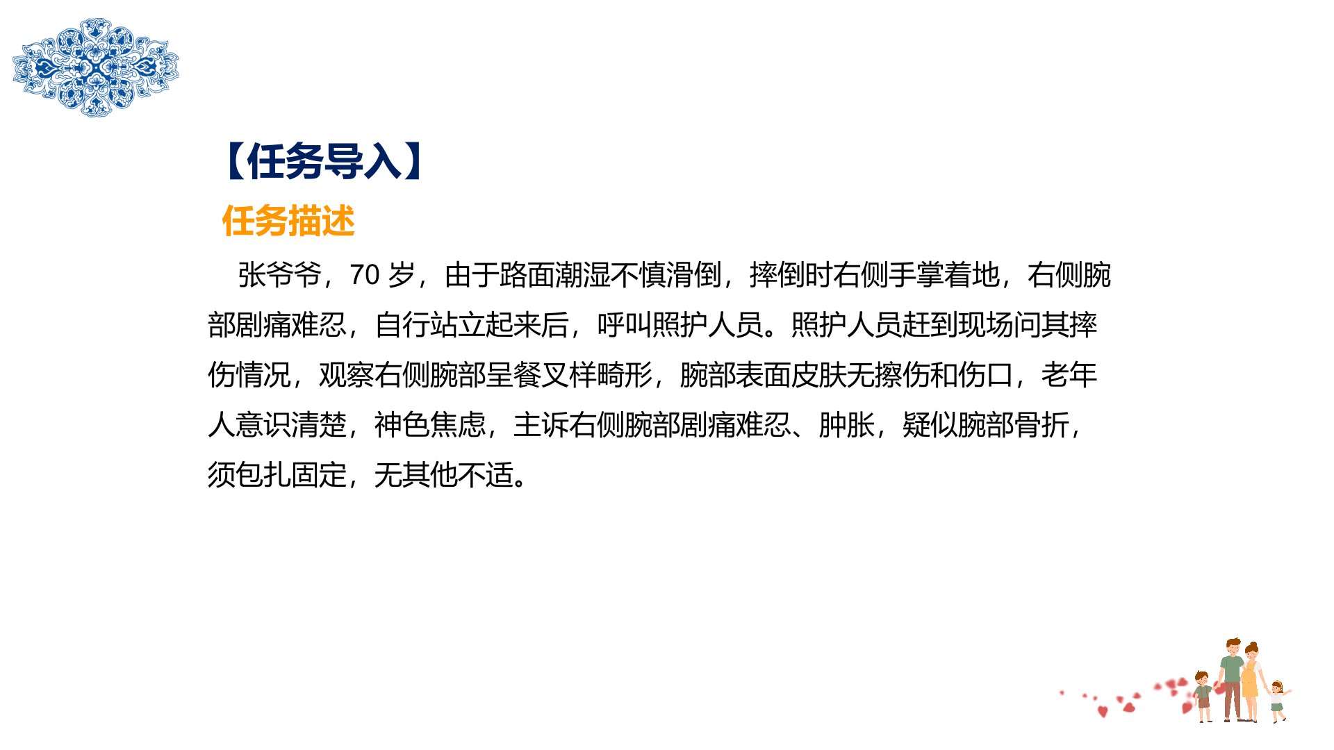 摘要三维目标知识目标:掌握骨折常用包扎固定方法了解老年人骨折表现。能力目标:能协助为老年人进行骨折后的初步固定。思政目标:发扬吃苦耐劳精神具备细心、耐心和责任心。任务导入与分析70岁张爷爷滑倒右侧腕部剧痛、肿胀疑似骨折需包扎固定。老年人因骨骼疏松、肌腱硬化等易骨折骨折表现分一般表现(局部疼痛、肿胀等)和特有体征(局部畸形、异常运动、骨擦音等)。常见骨折部位有腕部、椎体、髋部。实施流程先评估沟通取得老人理解配合;再准备物品;实施时报告并协助移老人置夹板固定观察不适;之后整理用物、洗手记录。注意事项怀疑骨折不可强制活动夹板要适配且固定关节松紧适度无棉垫时加衬垫开放性骨折不送回骨端固定时露出指(趾)端观察血运。
