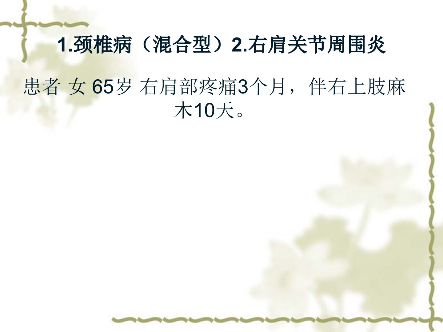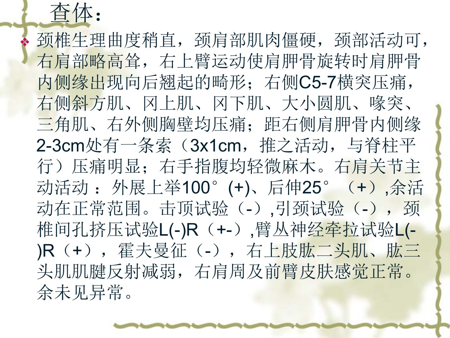 2018年6月7日骨四科病例汇报患者为65岁女性患颈椎病(混合型)和右肩关节周围炎右肩部疼痛3个月伴右上肢麻木10天。查体显示颈椎生理曲度稍直颈肩部肌肉僵硬右肩略高耸多处压痛右手指腹轻微麻木右肩关节外展上举100、后伸25余活动正常多种试验有异常表现右上肢肱二头肌等肌腱反射减弱。辅助检查显示颈椎生理曲度变直C46椎体骨刺样增生C56椎间隙变窄。诊断为混合型颈椎病和右肩关节周围炎。治疗方案包括向患者及家属讲解病情给予中药熏蒸、中频、牵引、冲击波等物理治疗手法推拿放松软组织指导功能锻炼适时行针刀松解翼状肩保守治疗。综合治疗16天后患者症状基本消失右肩关节活动度正常对治疗效果满意出院。出院注意事项包括保持正确姿势、避免剧烈运动、适度锻炼、避免受凉受潮及与医生保持联系。