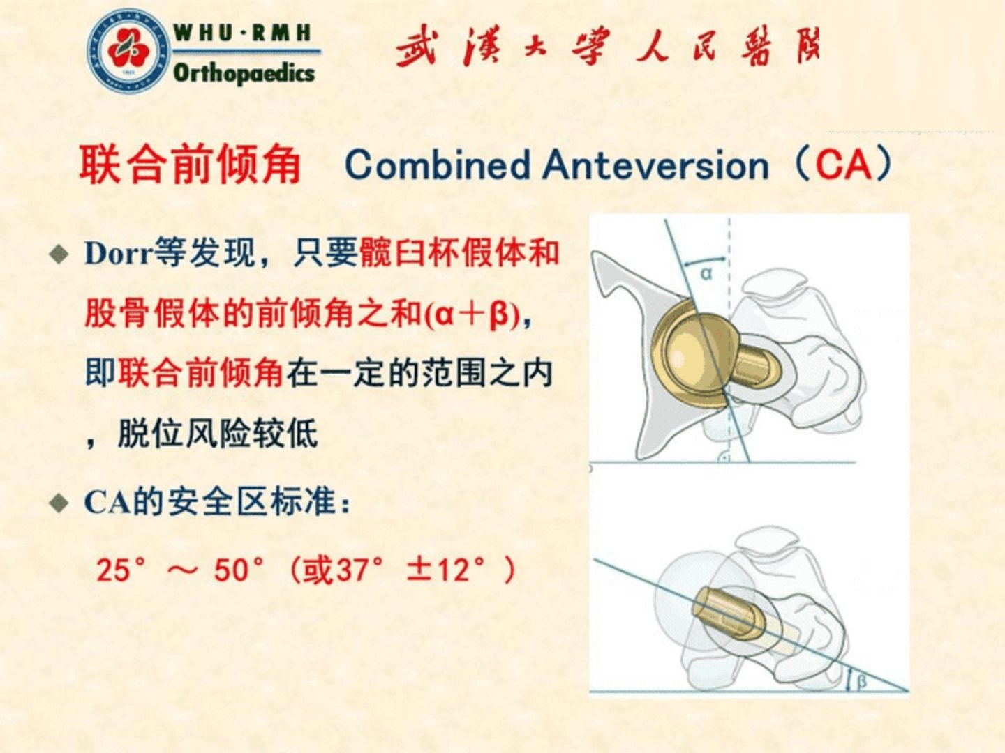联合前倾角在成人先天性髋关节发育不良骨关节炎全髋关节置换术摘要成人先天性髋关节发育不良(DDH)易引发骨关节炎全髋关节置换术(THA)是有效治疗手段。在手术中联合前倾角的准确把控至关重要。联合前倾角指髋臼杯前倾角与股骨柄前倾角之和。对于DDH患者其解剖结构异常增加了确定合适联合前倾角的难度。若联合前倾角不当过大易致髋关节前脱位过小则可能引发后脱位均会影响关节功能与患者生活质量。临床研究表明不同严重程度的DDH患者适宜的联合前倾角范围有所差异。手术中医生需综合考量患者个体情况借助影像学检查精准评估解剖特点以此确定合适的髋臼杯与股骨柄前倾角确保联合前倾角处于安全有效范围从而提升THA治疗DDH伴骨关节炎的临床效果降低并发症发生风险。