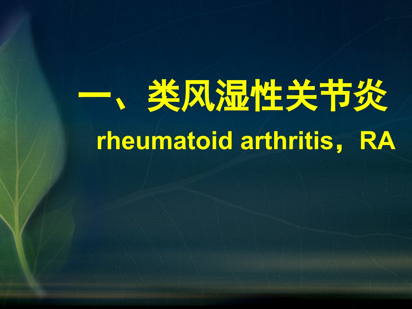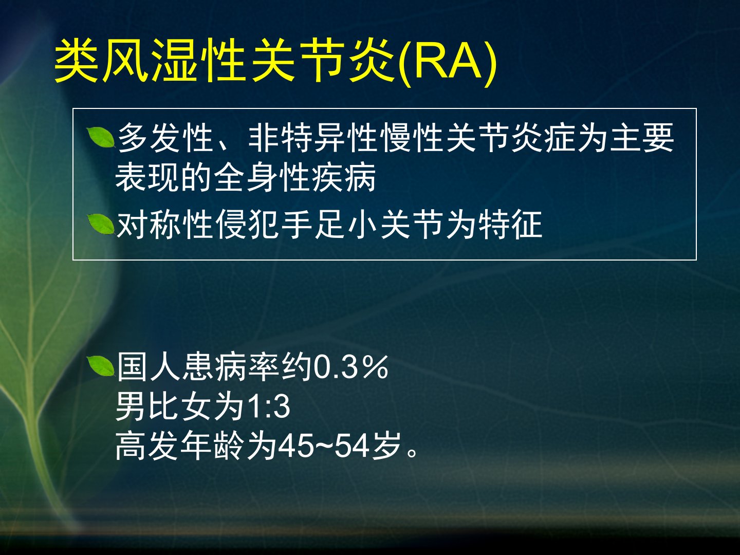 慢性关节病chronicarthropathy一、类风湿性关节炎rheumatoidarthritis,RA类风湿性关节炎(RA)多发性、非特异性慢性关节炎症为主要表现的全身性疾病对称性侵犯手足小关节为特征国人患病率约0.3%男比女为1:3高发年龄为45~54岁。多认为是在遗传易患素质的基础上加上环境因素而致病。遗传因素可能与人白细胞抗原-DR4(HLA—DR4)有关;环境因素主要为病毒或细菌感染。临床与病理病因不明病理:关节滑膜的非特异性慢性炎症渗出滑膜血管翳Pannus形成软骨及骨等关节结构类风湿性关节炎(RA)常有滑液囊炎、肌腱炎和腱鞘炎。临床与病理临床上发病隐匿对称性侵犯周围关节,以手...