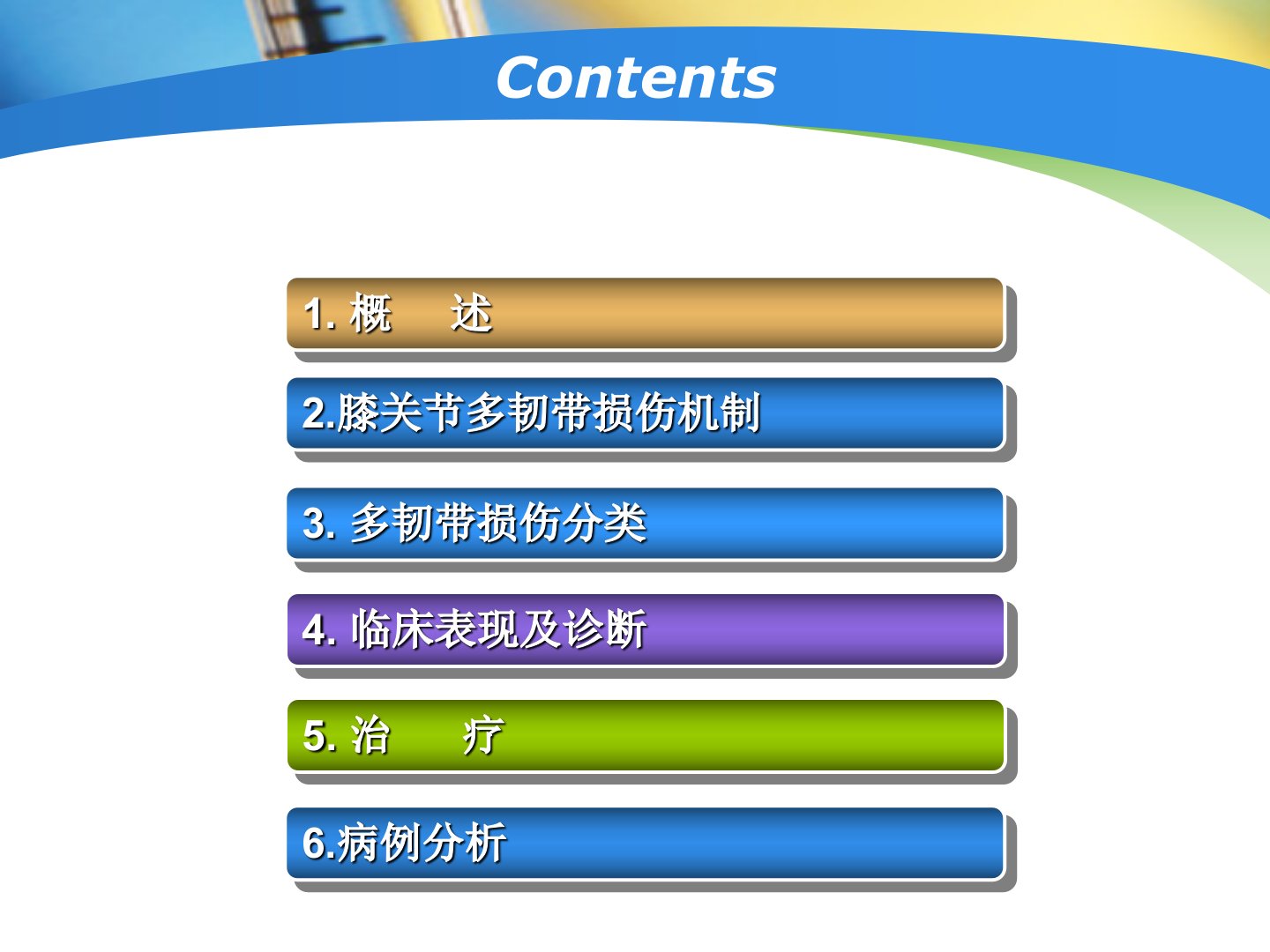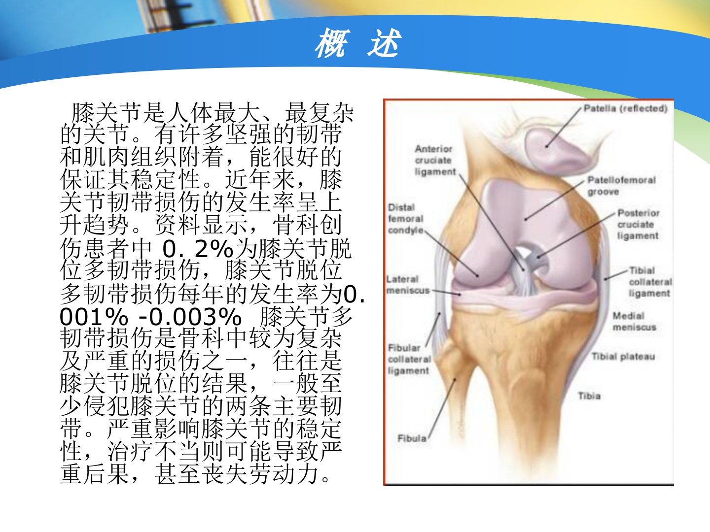 膝关节韧带损伤Contents1.概述2.膝关节多韧带损伤机制3.多韧带损伤分类4.临床表现及诊断5.治疗6.病例分析概述膝关节是人体最大、最复杂的关节。有许多坚强的韧带和肌肉组织附着,能很好的保证其稳定性。近年来,膝关节韧带损伤的发生率呈上升趋势。资料显示,骨科创伤患者中0.2%为膝关节脱位多韧带损伤,膝关节脱位多韧带损伤每年的发生率为0.001%-0.003%膝关节多韧带损伤是骨科中较为复杂及严重的损伤之一,往往是膝关节脱位的结果,一般至少侵犯膝关节的两条主要韧带。严重影响膝关节的稳定性,治疗不当则可能导致严重后果,甚至丧失劳动力。解剖概述一、内侧副韧带Medialcollateralli...