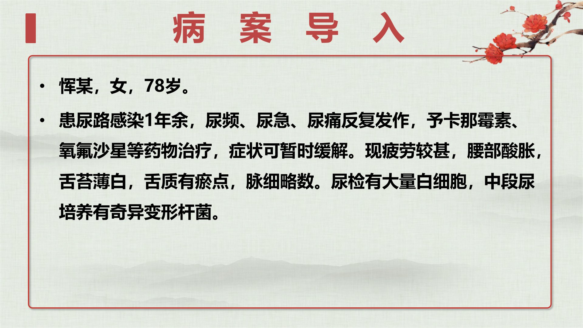 淋证目录【病因病机】【诊断与鉴别诊断】【辨证论治】【临证备要】【预防调护】【小结】【名医验案】【古籍摘要】【文献推介】恽某,女,78岁。患尿路感染1年余,尿频、尿急、尿痛反复发作,予卡那霉素、氧氟沙星等药物治疗,症状可暂时缓解。现疲劳较甚,腰部酸胀,舌苔薄白,舌质有瘀点,脉细略数。尿检有大量白细胞,中段尿培养有奇异变形杆菌。淋证是以小便频数,淋沥刺痛,欲出未尽,小腹拘急,或痛引腰腹为主症的疾病。西医学中的急慢性尿路感染、泌尿道结核、尿路结石、急慢性前列腺炎、化学性膀胱炎、乳糜尿以及尿道综合征等多可归属本病范畴,可参照本节辨证论治。泌尿系感染病原微生物引起的尿路感染性疾病表现为尿频、尿急、尿痛,...