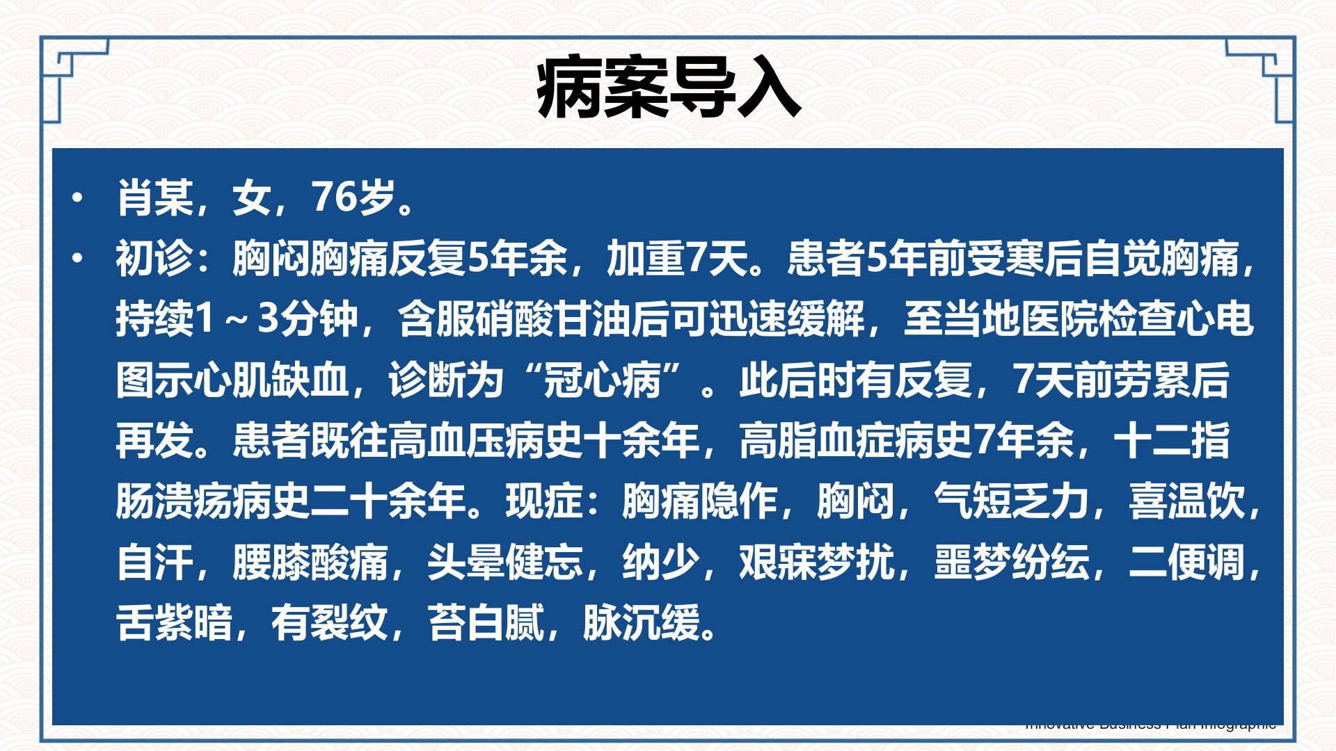 胸痹【病因病机】【诊断与鉴别诊断】【辨证论治】【临证备要】【预防调护】【小结】【名医验案】【古籍摘要】病案导入肖某,女,76岁。初诊:胸闷胸痛反复5年余,加重7天。患者5年前受寒后自觉胸痛,持续1~3分钟,含服硝酸甘油后可迅速缓解,至当地医院检查心电图示心肌缺血,诊断为“冠心病”。此后时有反复,7天前劳累后再发。患者既往高血压病史十余年,高脂血症病史7年余,十二指肠溃疡病史二十余年。现症:胸痛隐作,胸闷,气短乏力,喜温饮,自汗,腰膝酸痛,头晕健忘,纳少,艰寐梦扰,噩梦纷纭,二便调,舌紫暗,有裂纹,苔白腻,脉沉缓。胸痹是以胸部闷痛甚则胸痛彻背、喘息不得卧为主症的疾病。轻者仅感胸闷如窒,呼吸欠畅,...