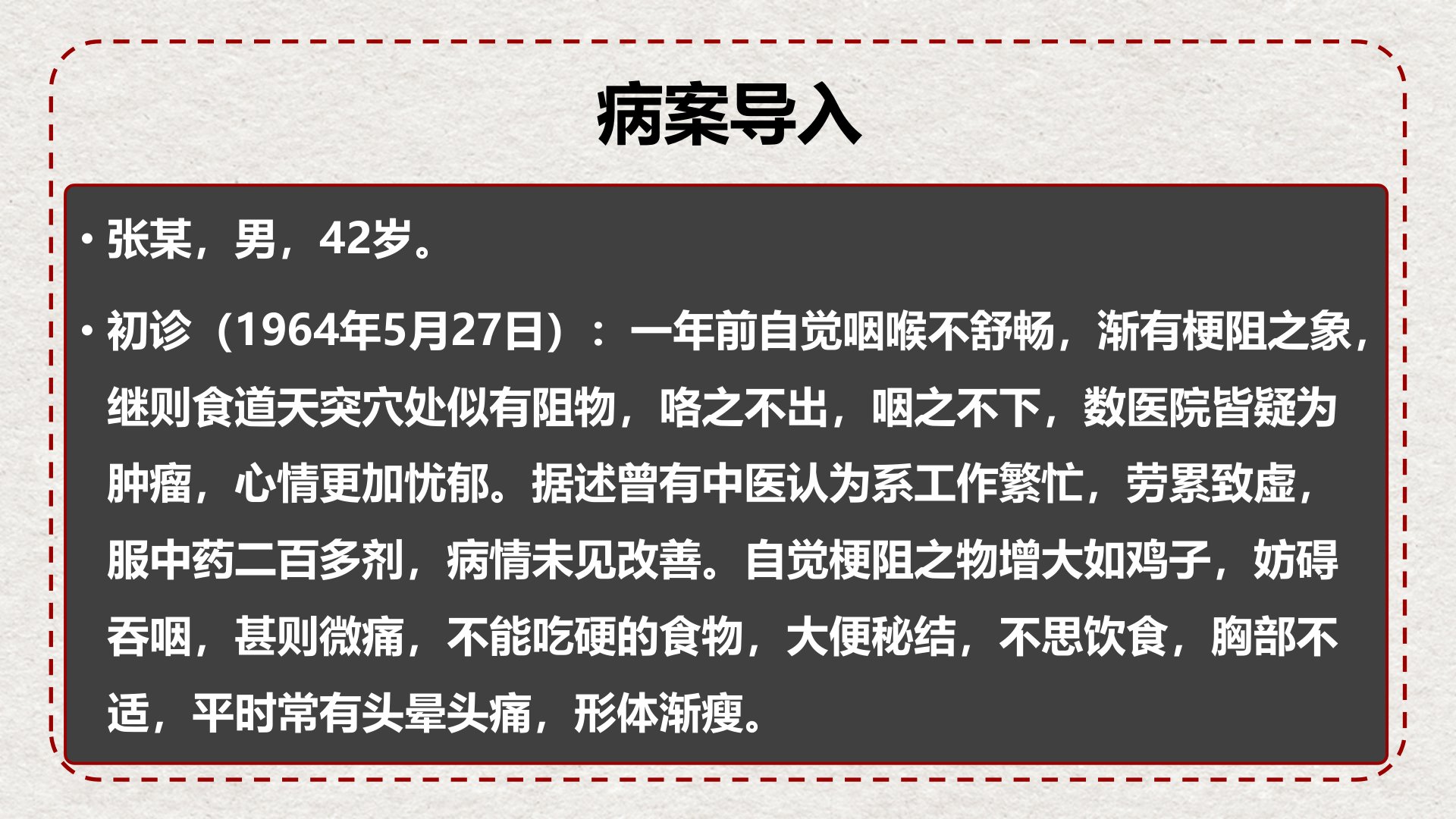 郁证目录【病因病机】【诊断与鉴别诊断】【辨证论治】【临证备要】【预防调护】【小结】【名医验案】【古籍摘要】【文献推介】病案导入张某,男,42岁。初诊(1964年5月27日):一年前自觉咽喉不舒畅,渐有梗阻之象,继则食道天突穴处似有阻物,咯之不出,咽之不下,数医院皆疑为肿瘤,心情更加忧郁。据述曾有中医认为系工作繁忙,劳累致虚,服中药二百多剂,病情未见改善。自觉梗阻之物增大如鸡子,妨碍吞咽,甚则微痛,不能吃硬的食物,大便秘结,不思饮食,胸部不适,平时常有头晕头痛,形体渐瘦。郁证是以心情抑郁,情绪不宁,胸部满闷,胁肋胀痛,或易怒易哭,或咽中如有异物梗阻为主症的疾病。郁有广义和狭义之分。广义的郁,包括...