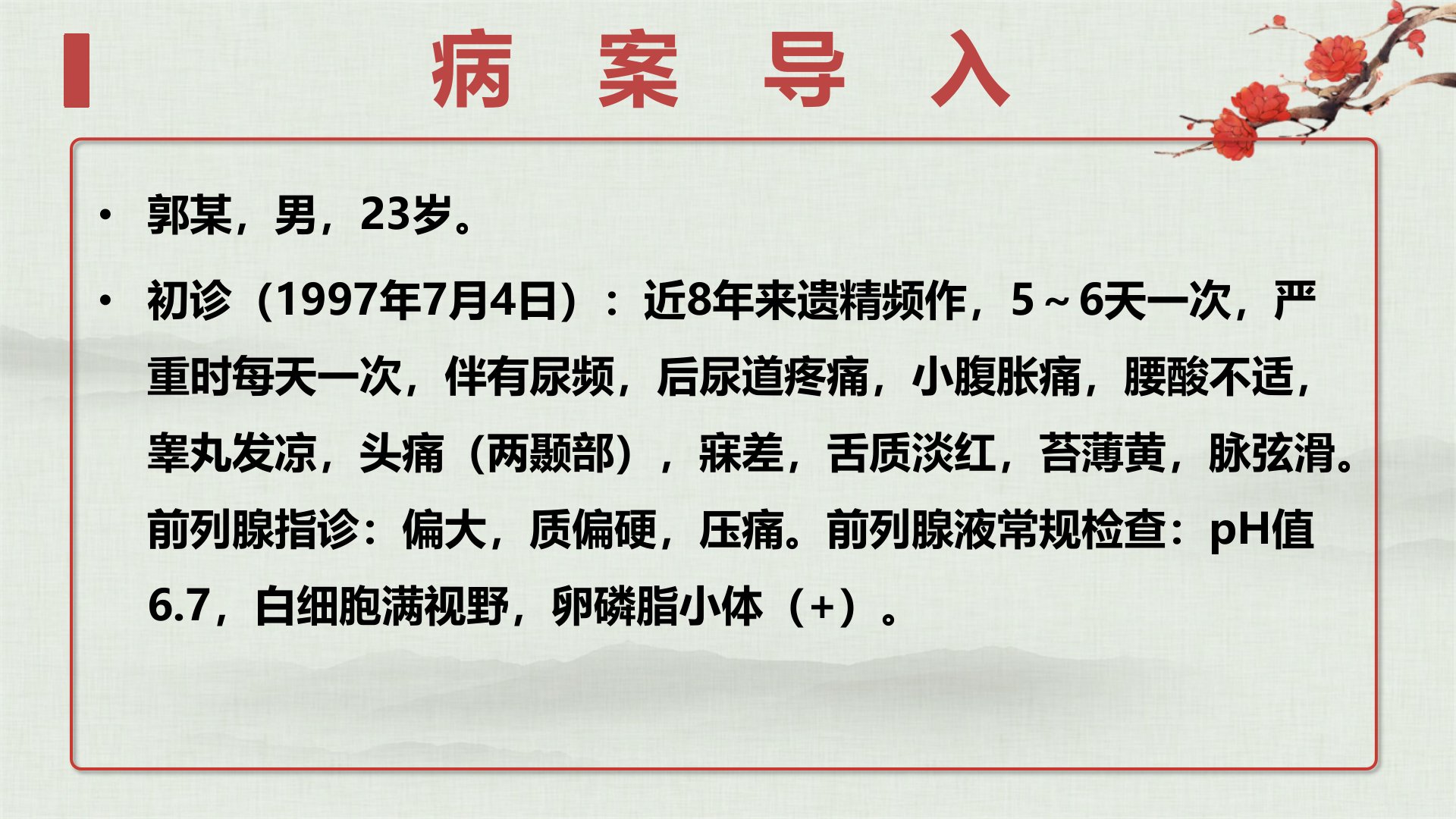 遗精目录【病因病机】【诊断与鉴别诊断】【辨证论治】【临证备要】【预防调护】【小结】【名医验案】【古籍摘要】【文献推介】郭某,男,23岁。初诊(1997年7月4日):近8年来遗精频作,5~6天一次,严重时每天一次,伴有尿频,后尿道疼痛,小腹胀痛,腰酸不适,睾丸发凉,头痛(两颞部),寐差,舌质淡红,苔薄黄,脉弦滑。前列腺指诊:偏大,质偏硬,压痛。前列腺液常规检查:pH值6.7,白细胞满视野,卵磷脂小体(+)。遗精是指以不因性活动而精液自行频繁泄出为主症的疾病,常伴有头昏、精神萎靡、腰腿酸软、失眠等。因梦而遗精者称为梦遗;无梦而遗精,或清醒时无性刺激情况下精液流出者称为滑精。西医学中的神经衰弱、神经...