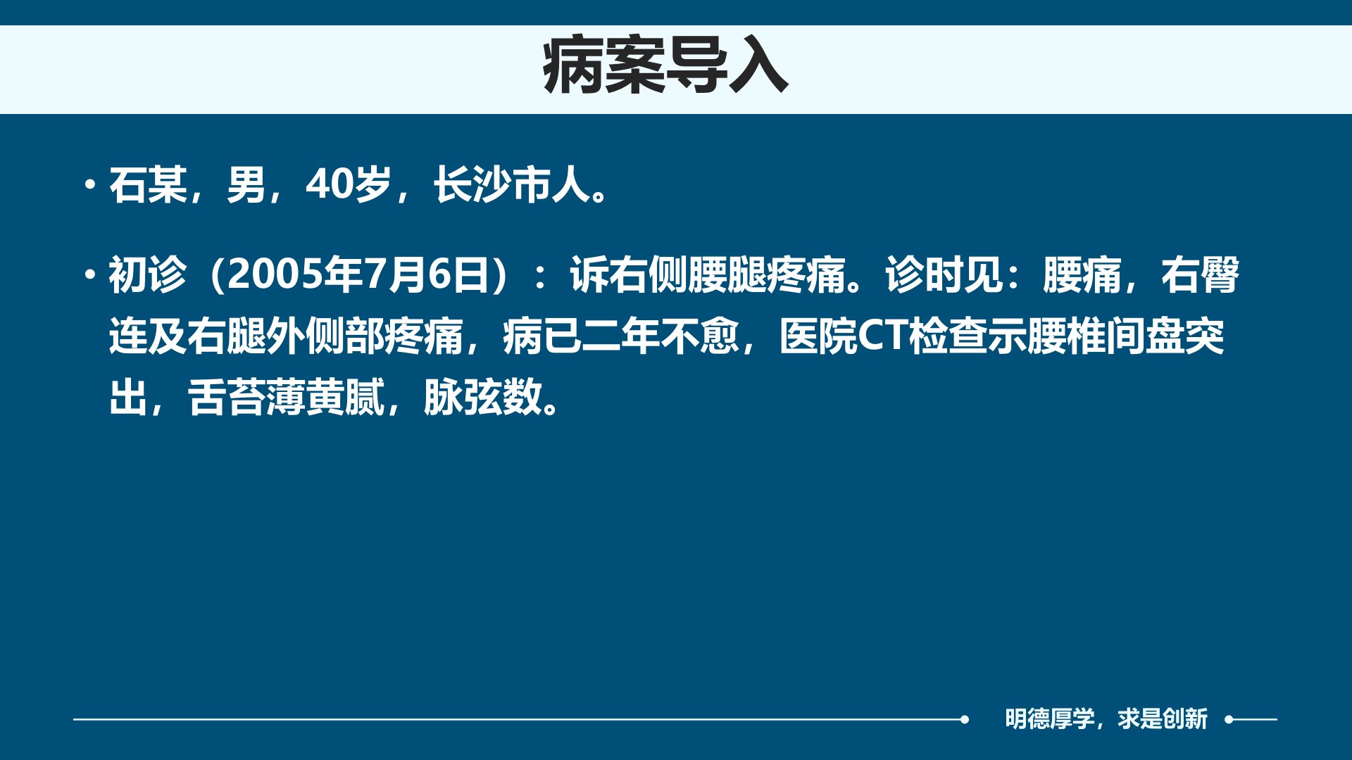 患者石某40岁长沙人初诊诉右侧腰腿疼痛两年不愈CT检查示腰椎间盘突出舌苔薄黄腻脉弦数被诊断为湿热瘀阻经络所致腰痛。腰痛有急慢性之分可由外邪侵袭、跌仆闪挫、年老体虚等引起病位与肾及相关经脉关系密切病理性质有虚实之分。西医学中的腰肌纤维炎、强直性脊柱炎、腰椎骨质增生、腰椎间盘病变、腰肌劳损等腰部病变均属腰痛范畴。治疗腰痛需分清标本缓急实证宜祛邪通络虚证宜补肾固本。石某属湿热瘀阻经络故用身痛逐瘀汤加减清利湿热、活血化瘀。经四诊治疗腰腿疼痛逐渐缓解至痊愈。预防腰痛需保持正确体位、适度劳逸、避免腰部受伤及外邪侵袭。腰痛预后一般良好但易反复治疗应内服外用多法联用。