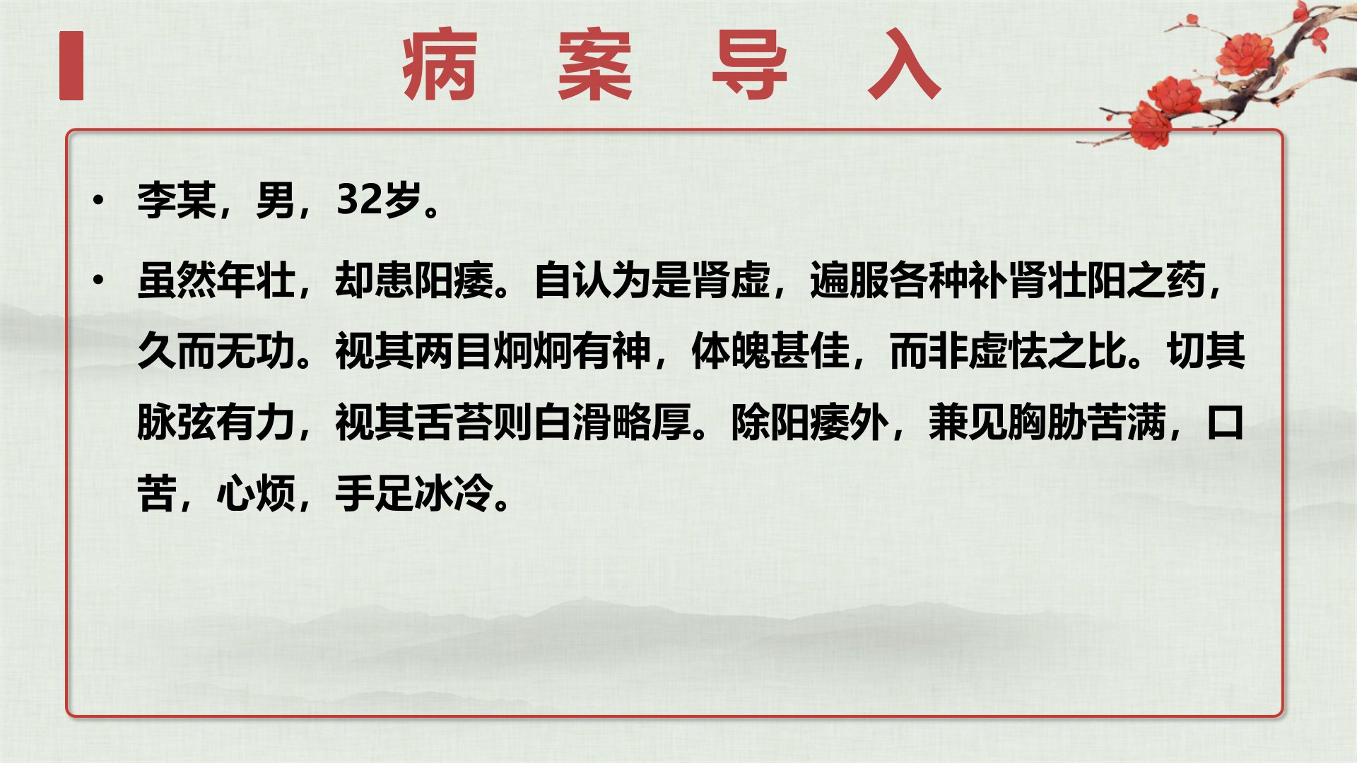 阳痿目录【病因病机】【诊断与鉴别诊断】【辨证论治】【临证备要】【预防调护】【小结】【名医验案】【古籍摘要】【文献推介】李某,男,32岁。虽然年壮,却患阳痿。自认为是肾虚,遍服各种补肾壮阳之药,久而无功。视其两目炯炯有神,体魄甚佳,而非虚怯之比。切其脉弦有力,视其舌苔则白滑略厚。除阳痿外,兼见胸胁苦满,口苦,心烦,手足冰冷。阳痿是指成年男子性交时阴茎痿软不举,或举而不坚,或坚而不久,无法进行正常性生活为主症的疾病。西医学中各种功能性及器质性疾病造成的男子阴茎勃起功能障碍等归属于本病范畴,可参照本节辨证论治。勃起障碍发生在各个年龄段的成年男性可分为性欲改变、勃起功能障碍、射精障碍一般需要进行体格检...