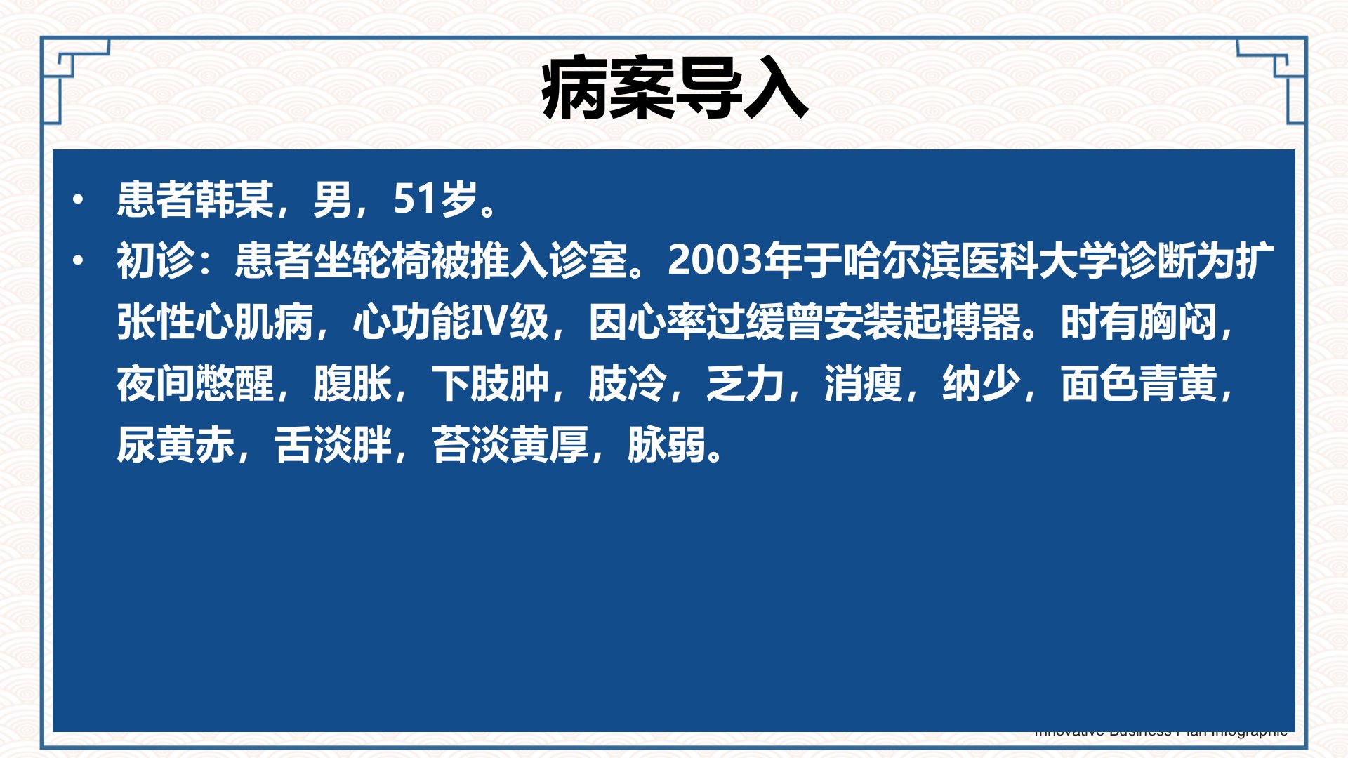 心衰【病因病机】【诊断与鉴别诊断】【辨证论治】【临证备要】【预防调护】【小结】【名医验案】【古籍摘要】病案导入患者韩某,男,51岁。初诊:患者坐轮椅被推入诊室。2003年于哈尔滨医科大学诊断为扩张性心肌病,心功能Ⅳ级,因心率过缓曾安装起搏器。时有胸闷,夜间憋醒,腹胀,下肢肿,肢冷,乏力,消瘦,纳少,面色青黄,尿黄赤,舌淡胖,苔淡黄厚,脉弱。心衰是以乏力、心悸、喘息、肢体水肿为主症的疾病,为多种慢性心系疾病反复发作,迁延不愈,日渐加重的终末期阶段。轻者可仅表现为气短、不耐劳累,重者可见喘息心悸,不能平卧,或伴咳吐痰涎,尿少肢肿,或口唇发绀,甚至出现喘悸不休,汗出肢冷,表情淡漠或烦躁不安等厥脱危象...