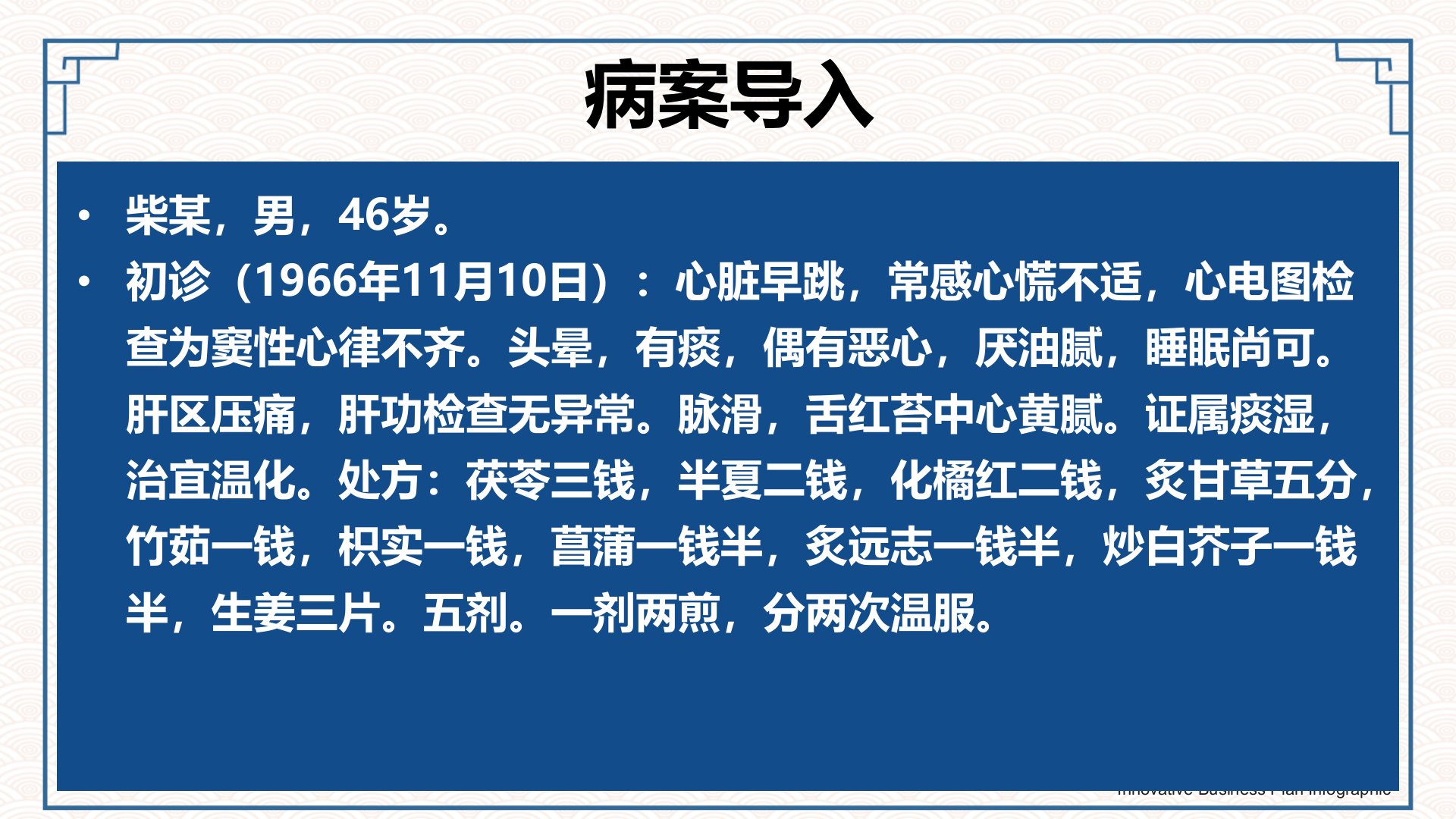 心悸【病因病机】【诊断与鉴别诊断】【辨证论治】【临证备要】【预防调护】【小结】【名医验案】【古籍摘要】病案导入柴某,男,46岁。初诊(1966年11月10日):心脏早跳,常感心慌不适,心电图检查为窦性心律不齐。头晕,有痰,偶有恶心,厌油腻,睡眠尚可。肝区压痛,肝功检查无异常。脉滑,舌红苔中心黄腻。证属痰湿,治宜温化。处方:茯苓三钱,半夏二钱,化橘红二钱,炙甘草五分,竹茹一钱,枳实一钱,菖蒲一钱半,炙远志一钱半,炒白芥子一钱半,生姜三片。五剂。一剂两煎,分两次温服。心悸是以心中悸动、惊惕不安甚则不能自主为主症的疾病。临床多呈发作性,每因体虚劳倦、七情所伤、感受外邪等发作,常伴胸闷、气短、失眠、健...