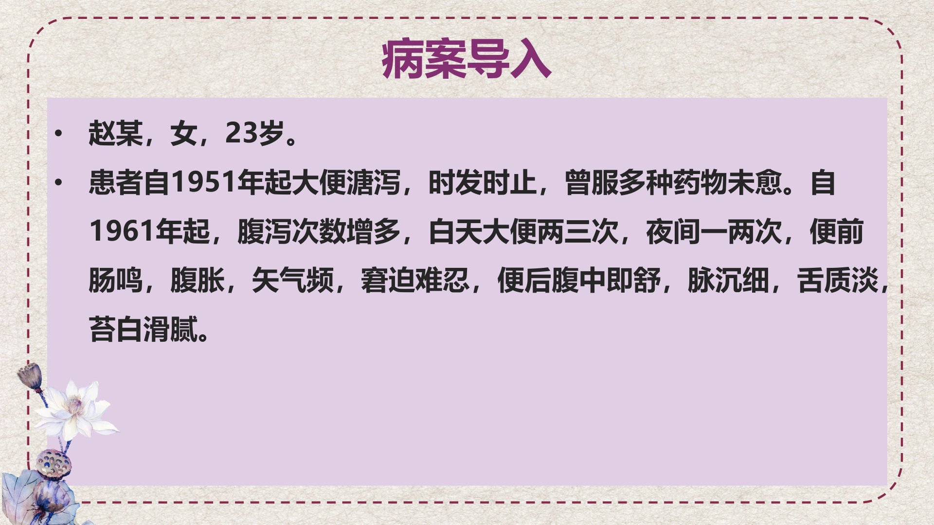 泄泻病案导入赵某,女,23岁。患者自1951年起大便溏泻,时发时止,曾服多种药物未愈。自1961年起,腹泻次数增多,白天大便两三次,夜间一两次,便前肠鸣,腹胀,矢气频,窘迫难忍,便后腹中即舒,脉沉细,舌质淡,苔白滑腻。泄泻是以排便次数增多、粪便稀溏甚至泻出如水样为主症的疾病。古代将大便溏薄而势缓者称为泄,大便清稀如水而势急者称为泻,现统称为泄泻。西医学急慢性肠炎、消化不良、肠易激综合征、功能性腹泻等以泄泻为主症者,可参照本节辨证论治。肠炎各种类型肠炎的原因不尽相同常见有腹痛、腹泻、血便、发热等症状各年龄段均可发病大部分患者均可治愈消化不良表现为上腹部不适症状的临床综合征上腹痛、上腹烧灼感、餐后...
