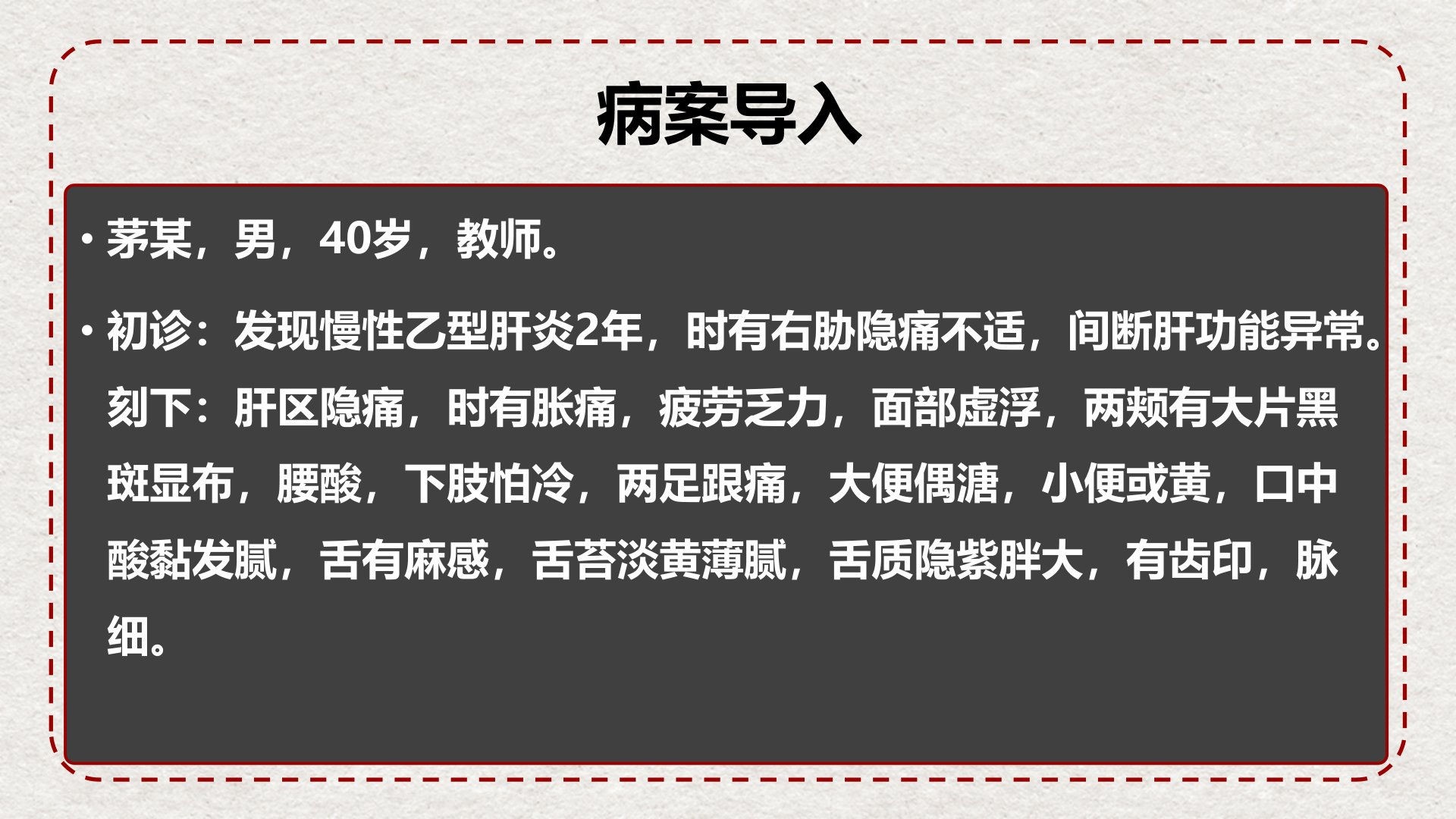 茅某40岁男性教师患有慢性乙型肝炎2年时有右胁隐痛不适间断肝功能异常被诊断为胁痛。胁痛指一侧或两侧胁肋部疼痛西医学中的急慢性肝炎、胆囊炎等疾病过程中以胁痛为主要表现者可参照本节辨证论治。《黄帝内经》指出胁痛与肝胆有关后世医家认为胁痛还与肾、脾胃相关病因主要包括情志不遂、饮食不节等基本病机为肝络失和可概括为“不通则痛”与“不荣则痛”两类。胁痛治疗原则为疏肝和络止痛实证采用疏肝理气、活血通络、清利湿热之法虚证则滋阴养血柔肝。茅某证属湿热瘀结、肝脾两伤、久病及肾治疗采用化肝解毒、温养肾气之法处方为虎杖、平地木、红藤、土茯苓、贯众等45剂后症状好转后调整药方继续服用45剂后症状进一步改善。慢性乙型肝炎病程长病机特点是湿热瘀毒互相交结故以化解肝毒、疏肝活血为主要治疗思路辅以温肾滋阴药物。