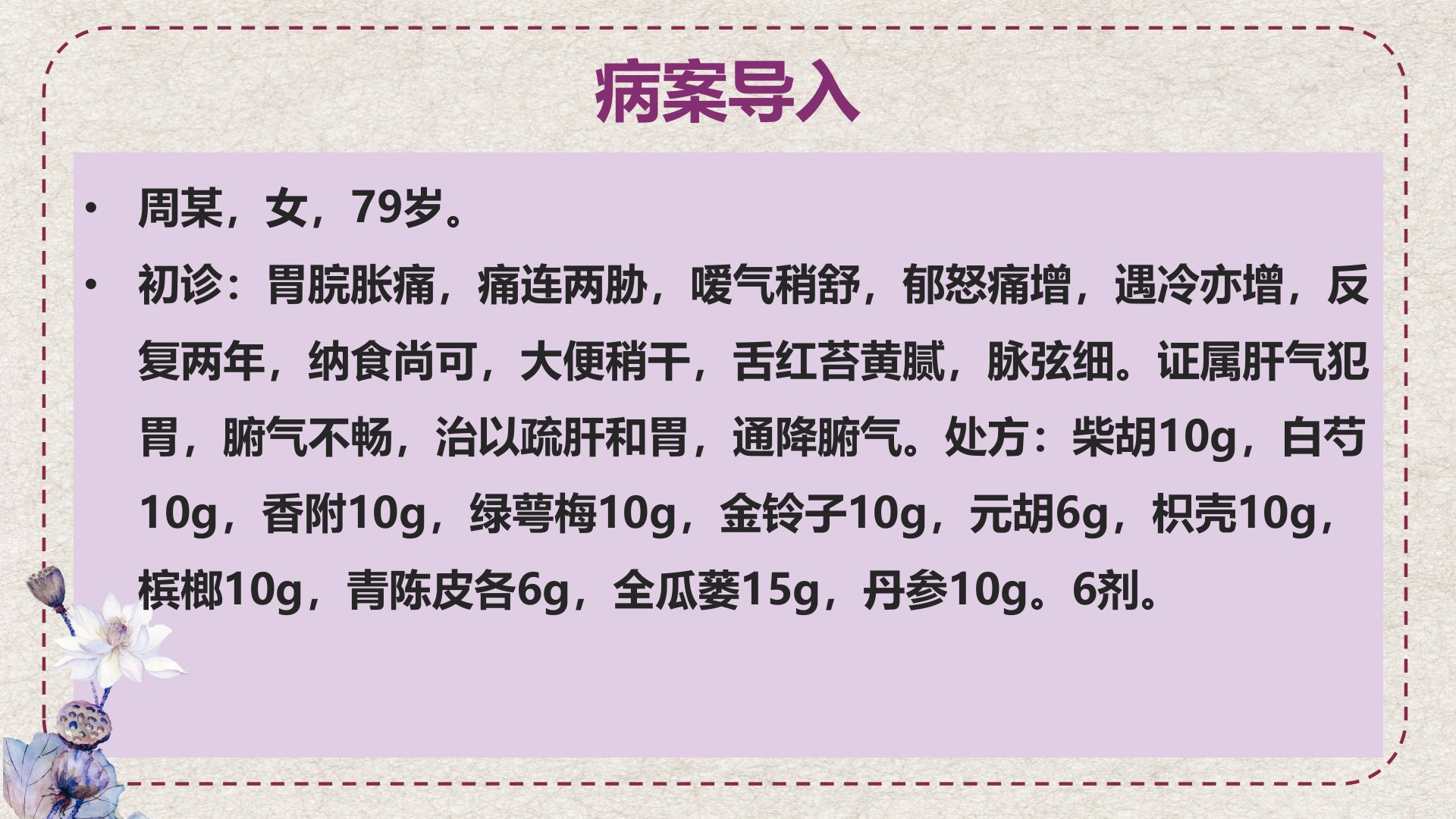 胃痛病案导入周某,女,79岁。初诊:胃脘胀痛,痛连两胁,嗳气稍舒,郁怒痛增,遇冷亦增,反复两年,纳食尚可,大便稍干,舌红苔黄腻,脉弦细。证属肝气犯胃,腑气不畅,治以疏肝和胃,通降腑气。处方:柴胡10g,白芍10g,香附10g,绿萼梅10g,金铃子10g,元胡6g,枳壳10g,槟榔10g,青陈皮各6g,全瓜蒌15g,丹参10g。6剂。胃痛,又称胃脘痛,是以胃脘部近心窝处疼痛为主症的疾病。西医学中急性胃炎、慢性胃炎、功能性消化不良、胃及十二指肠溃疡等多可归属本病范围,可参照本节辨证论治。1.心下2.胃脘3.大腹4.小腹5.少腹6.胁肋7.虚里8.左、右胸9.胸膺胃炎多种不同病因引起的胃黏膜急性和慢...