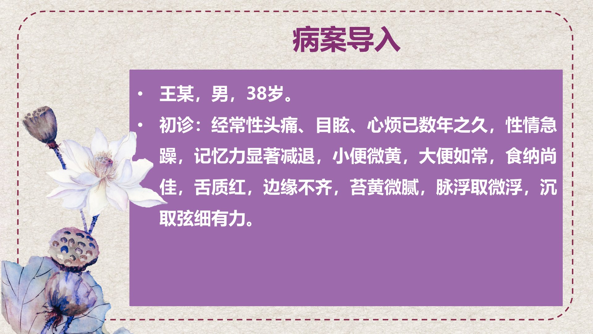 头痛王某,男,38岁。初诊:经常性头痛、目眩、心烦已数年之久,性情急躁,记忆力显著减退,小便微黄,大便如常,食纳尚佳,舌质红,边缘不齐,苔黄微腻,脉浮取微浮,沉取弦细有力。病案导入头痛,亦称头风,是以自觉头部疼痛为主症的疾病。头痛既可单独出现,亦可伴见于多种疾病的过程中。西医学中的偏头痛、紧张性头痛、丛集性头痛及外伤性头痛等,可参照本节辨证论治。偏头痛常见的反复发作的偏侧头部疼痛性疾患中青年、女性人群更为常见可通过生活习惯调整及药物治疗控制病情一般预后良好,随年长而逐渐不再发作紧张性头痛属常见的原发性头痛类型表现为头痛、肌肉紧张、失眠等症状起病缓慢,逐渐加重,可持续数日或数年以药物治疗、物理治...