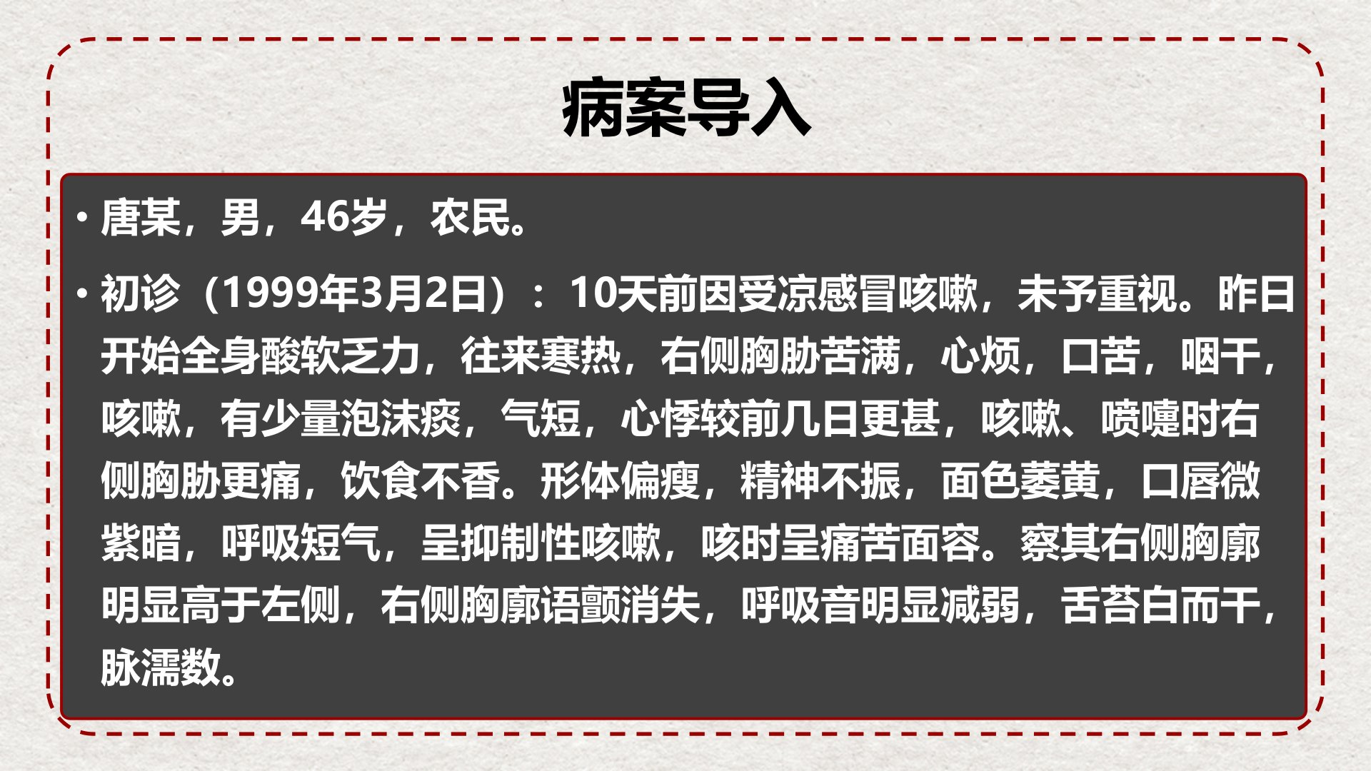 痰饮目录【病因病机】【诊断与鉴别诊断】【辨证论治】【临证备要】【预防调护】【小结】【名医验案】【古籍摘要】【文献推介】病案导入唐某,男,46岁,农民。初诊(1999年3月2日):10天前因受凉感冒咳嗽,未予重视。昨日开始全身酸软乏力,往来寒热,右侧胸胁苦满,心烦,口苦,咽干,咳嗽,有少量泡沫痰,气短,心悸较前几日更甚,咳嗽、喷嚏时右侧胸胁更痛,饮食不香。形体偏瘦,精神不振,面色萎黄,口唇微紫暗,呼吸短气,呈抑制性咳嗽,咳时呈痛苦面容。察其右侧胸廓明显高于左侧,右侧胸廓语颤消失,呼吸音明显减弱,舌苔白而干,脉濡数。痰饮是指体内水液输布、运化失常,停积于某些部位为主症的疾病。痰,古通“淡”,是指水...