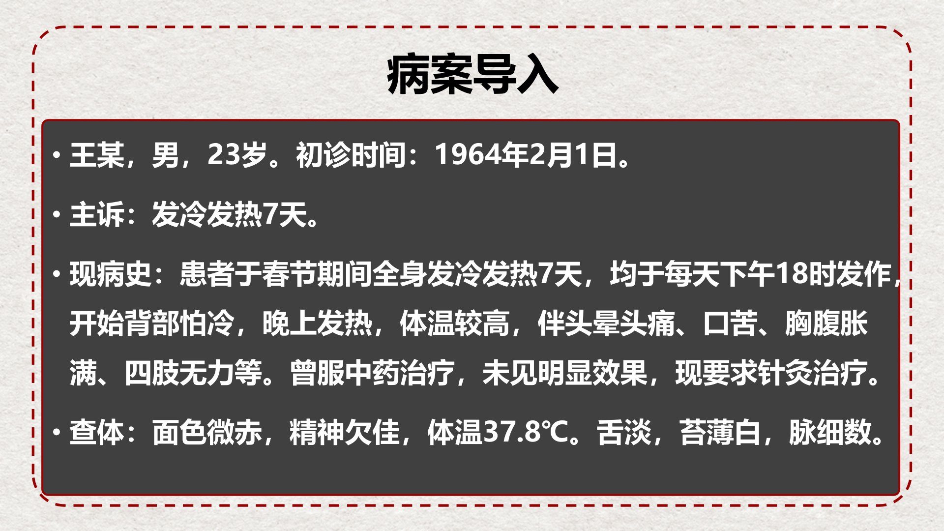 疟疾目录【病因病机】【诊断与鉴别诊断】【辨证论治】【临证备要】【预防调护】【小结】【名医验案】【古籍摘要】【文献推介】病案导入王某,男,23岁。初诊时间:1964年2月1日。主诉:发冷发热7天。现病史:患者于春节期间全身发冷发热7天,均于每天下午18时发作,开始背部怕冷,晚上发热,体温较高,伴头晕头痛、口苦、胸腹胀满、四肢无力等。曾服中药治疗,未见明显效果,现要求针灸治疗。查体:面色微赤,精神欠佳,体温37.8℃。舌淡,苔薄白,脉细数。疟疾是以寒战、壮热、头痛、汗出、休作有时为主症的疾病。常发于夏秋季节,其他季节亦可发生。发病以南方地区多见,但全国各地均有。瘴疟主要在南方地区发病。西医学中的疟...
