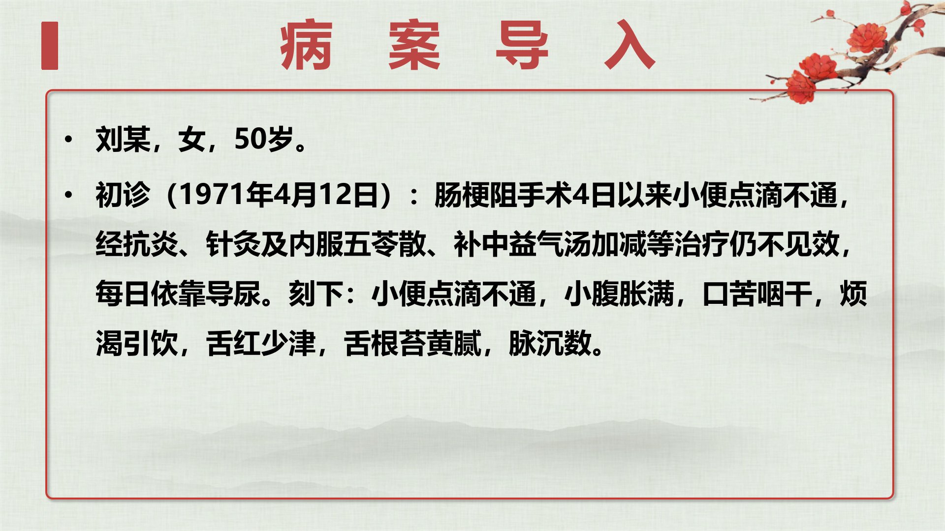 癃闭目录【病因病机】【诊断与鉴别诊断】【辨证论治】【临证备要】【预防调护】【小结】【名医验案】【古籍摘要】【文献推介】刘某,女,50岁。初诊(1971年4月12日):肠梗阻手术4日以来小便点滴不通,经抗炎、针灸及内服五苓散、补中益气汤加减等治疗仍不见效,每日依靠导尿。刻下:小便点滴不通,小腹胀满,口苦咽干,烦渴引饮,舌红少津,舌根苔黄腻,脉沉数。癃闭是以小便量少、排尿困难甚则小便闭塞不通为主症的疾病。其中,小便不畅,点滴而短少,病势较缓者称为癃;小便闭塞,点滴不通,病势较急者称为闭。二者都指排尿困难,故合称为癃闭。尿潴留不能自然、充分排空膀胱内的尿液常见于男性,多由良性前列腺增生引起急性尿潴留...