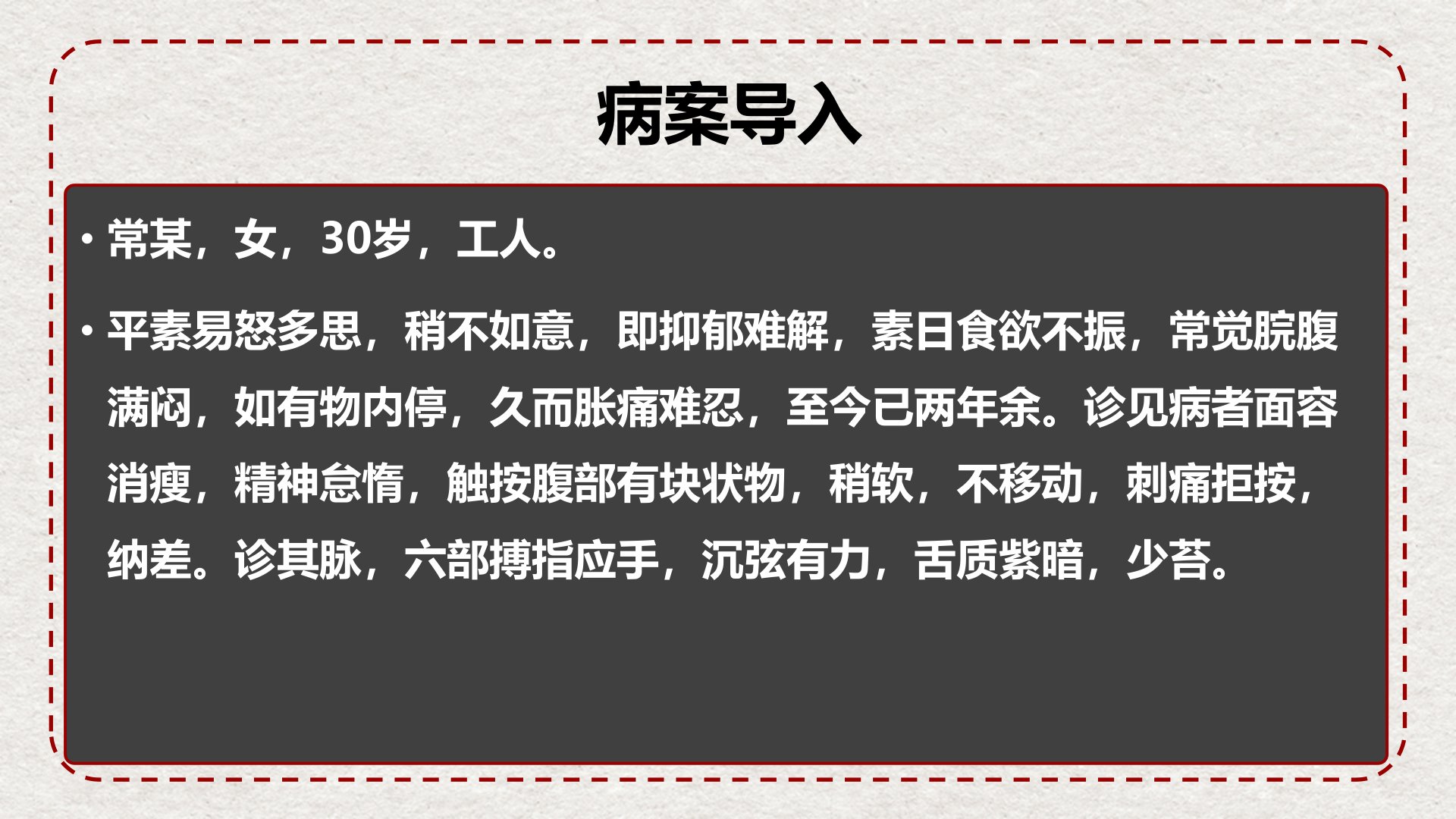 积聚目录【病因病机】【诊断与鉴别诊断】【辨证论治】【临证备要】【预防调护】【小结】【名医验案】【古籍摘要】【文献推介】病案导入常某,女,30岁,工人。平素易怒多思,稍不如意,即抑郁难解,素日食欲不振,常觉脘腹满闷,如有物内停,久而胀痛难忍,至今已两年余。诊见病者面容消瘦,精神怠惰,触按腹部有块状物,稍软,不移动,刺痛拒按,纳差。诊其脉,六部搏指应手,沉弦有力,舌质紫暗,少苔。积聚是以腹内结块,或胀或痛为主症的疾病。积,触之有形,结块固定不移,痛有定处,病在血分,多为脏病;聚,触之无形,结块聚散无常,痛无定处,病在气分,多为腑病。因积与聚关系密切,故两者往往一并论述。西医学中多种原因引起的腹腔肿...
