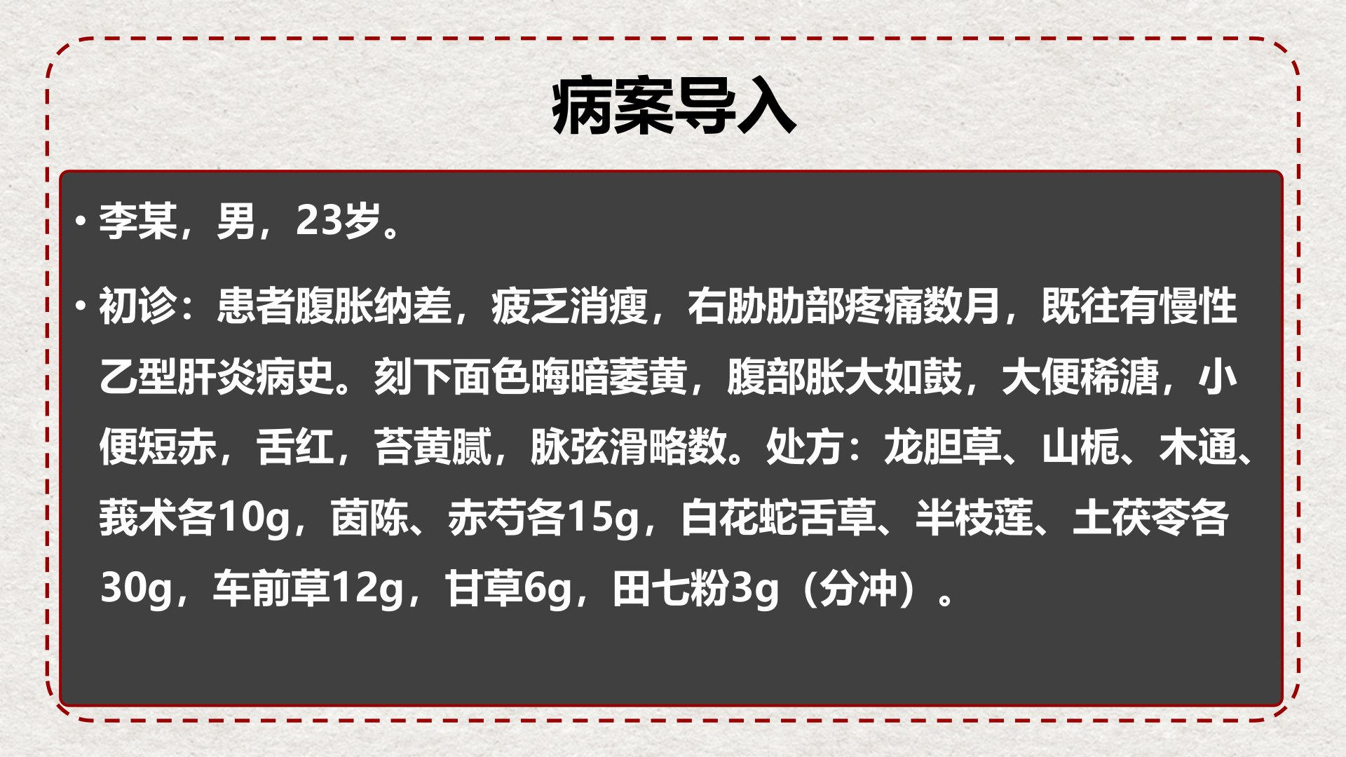 鼓胀目录【病因病机】【诊断与鉴别诊断】【辨证论治】【临证备要】【预防调护】【小结】【名医验案】【古籍摘要】【文献推介】病案导入李某,男,23岁。初诊:患者腹胀纳差,疲乏消瘦,右胁肋部疼痛数月,既往有慢性乙型肝炎病史。刻下面色晦暗萎黄,腹部胀大如鼓,大便稀溏,小便短赤,舌红,苔黄腻,脉弦滑略数。处方:龙胆草、山栀、木通、莪术各10g,茵陈、赤芍各15g,白花蛇舌草、半枝莲、土茯苓各30g,车前草12g,甘草6g,田七粉3g(分冲)。鼓胀是指以腹部胀大如鼓为主症的疾病。临床以腹大胀满,绷急如鼓,皮色苍黄,脉络暴露为特征,故名鼓胀。又名“单腹胀”“臌”“蜘蛛蛊”。西医学中因病毒性肝炎、血吸虫病等多种...