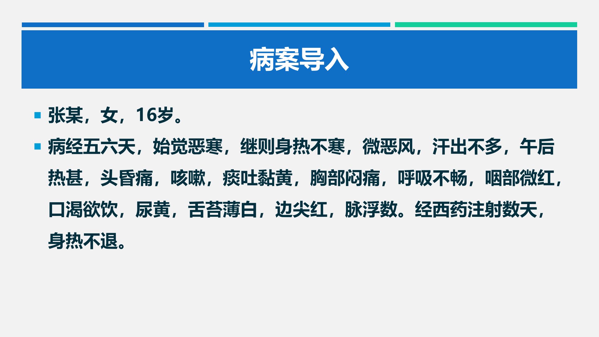 感冒中医内科病案导入以16岁女性患者张某为例其病经五六天恶寒身热、咳嗽痰黄、咽部微红经西药注射数天仍未退热。西医学的普通感冒、急性上呼吸道感染属于本病范畴流行性感冒属于时行感冒范畴。感冒病因病机包括六淫病邪外感、时行疫毒、卫气强弱等决定因素为卫气强弱与邪气盛衰病位在肺卫病机为外邪侵袭肺卫功能失调。预后与感邪类型、正气强弱有关体质差异影响感受外邪类型。诊断包括血常规等检查需与风温、鼻渊鉴别。辨证论治分实证与虚体感冒。临证要点包括鉴别普通与时行感冒、辨清病邪性质、灵活辨证、遵循“治上焦如羽”原则。名医熊继柏结合实践提出感冒用药须结合时令气候治疗感冒高热用表里双解法寒热夹杂证应当寒热合治。名医验案以张某为例初诊属风热袭表治以辛凉解表药后体温正常虽再次受凉热起再投仍然获效后转从清肺化痰治之尽收全功。