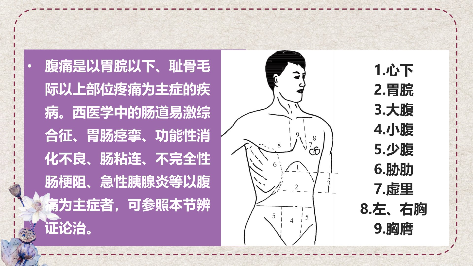 腹痛是以胃脘以下、耻骨毛际以上部位疼痛为主症的疾病西医学中多种以腹痛为主症的疾病可参照其辨证论治。关于腹痛《内经》对其病因病机有较全面的认识指出寒邪、湿邪、热邪等是导致腹痛发生的主要原因。张仲景则指出腹痛虚实寒热的辨证方法后世医家又不断对其进行补充与拓展。腹痛病因多为感受外邪、饮食所伤、情志失调及素体虚弱、劳倦内伤等基本病机为气机阻滞、脉络痹阻或脉络失养涉及多个脏腑和经脉病理因素主要有寒凝、火郁、食积、气滞、血瘀等。治疗上多以“通”字立法根据不同证型施以相应治法如寒邪内阻用良附丸合正气天香散加减湿热壅滞用大承气汤等。预防调护方面要注意起居饮食畅情志避风寒。腹痛初期多为实证病久多为虚证或虚实夹杂证预后上病程短正气足者良好重症可致厥脱之危证久病失治误治可变生积聚。