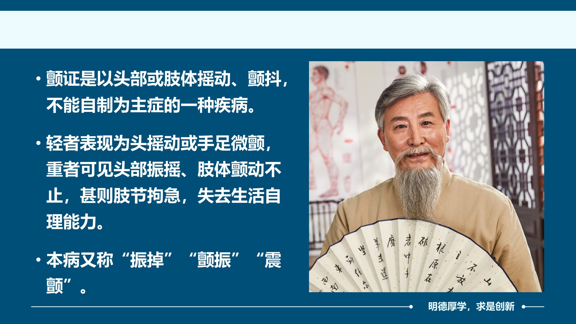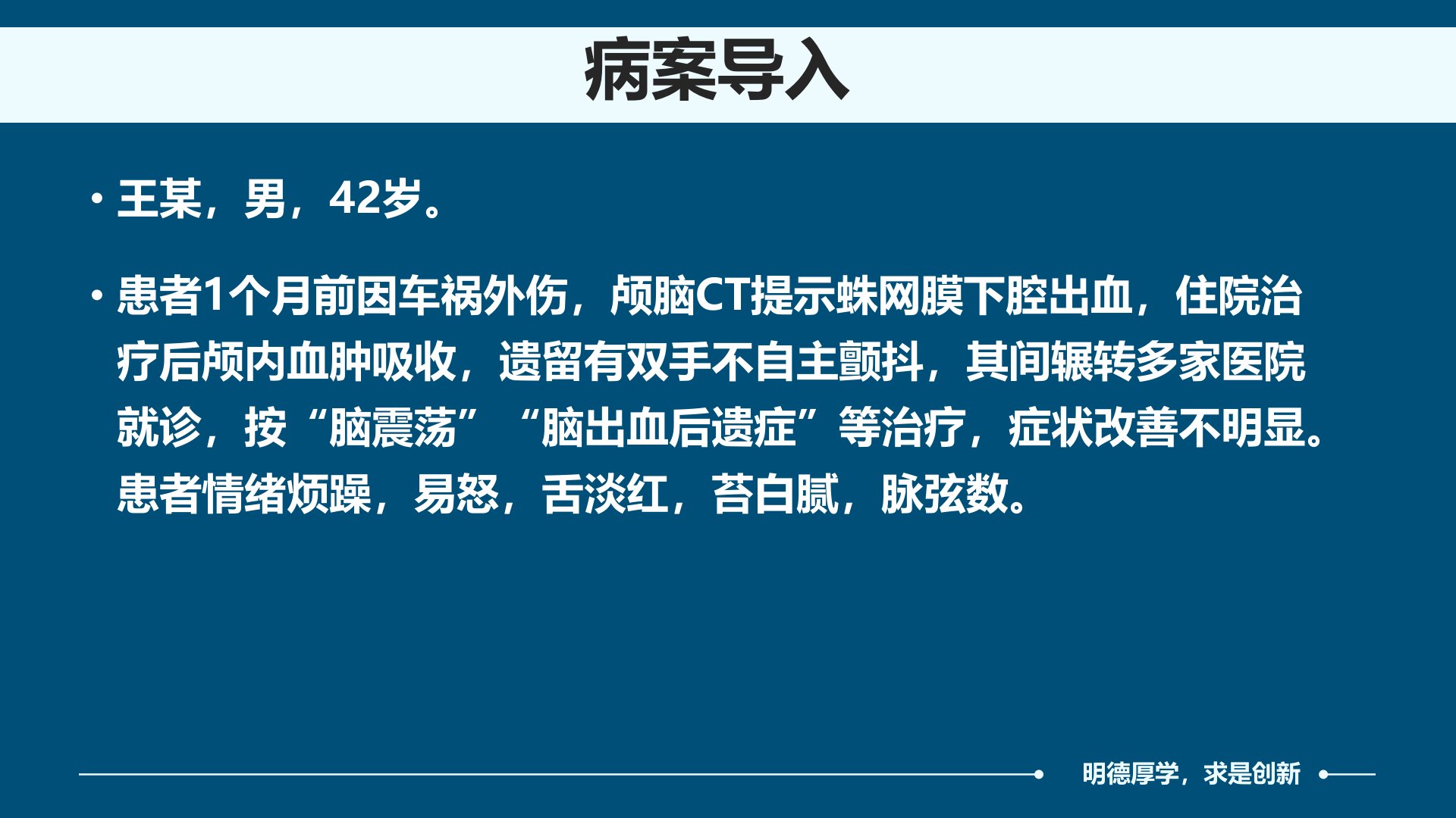 王某42岁男性1个月前因车祸导致蛛网膜下腔出血治疗后遗留双手不自主颤抖辗转多家医院按“脑震荡”“脑出血后遗症”治疗效果不明显。患者情绪烦躁易怒舌淡红苔白腻脉弦数。颤证以头部或肢体摇动、颤抖不能自制为主症轻者头或手足微颤重者头部振摇、肢体颤动不止。西医学中震颤麻痹(帕金森病)、肝豆状核变性、原发性震颤等具有颤证特征的疾病属本病范畴。颤证病因主要有年老体虚、情志过极、饮食不节、劳逸失当等病机为肝风内动筋脉失养病位在筋脉与肝、肾、脾等脏密切相关病理性质为本虚标实。治疗原则是息风柔筋、补虚泻实初期清热、化痰、息风为主病程较长则滋补肝肾、益气养血为主。王某病机为脑海瘀阻清窍蒙蔽处方以达气郁、疏血脉、涤痰浊、开窍、平肝风、止震颤为主后症状完全改善。