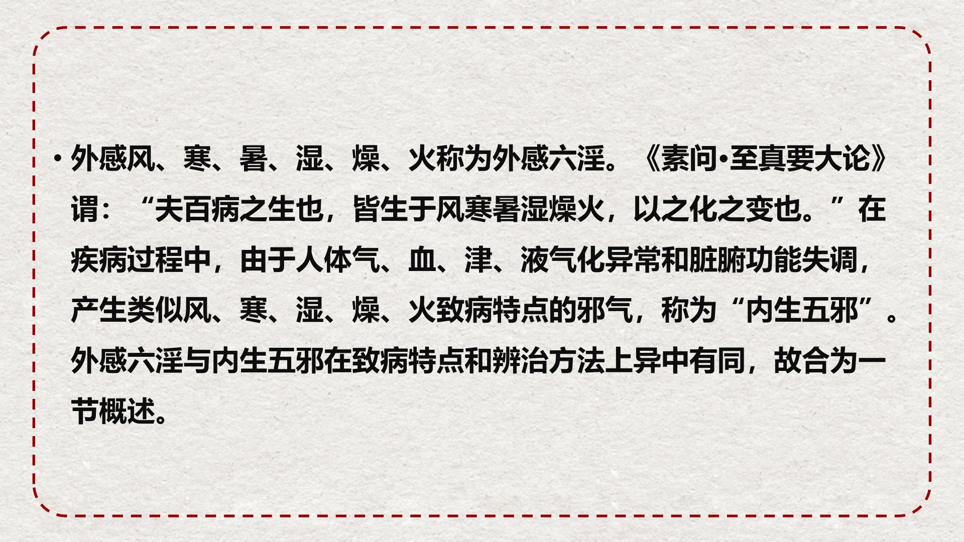 中医内科疾病辨证论治概要第一节风寒暑湿燥火辨治概要外感风、寒、暑、湿、燥、火称为外感六淫。《素问·至真要大论》谓:“夫百病之生也,皆生于风寒暑湿燥火,以之化之变也。”在疾病过程中,由于人体气、血、津、液气化异常和脏腑功能失调,产生类似风、寒、湿、燥、火致病特点的邪气,称为“内生五邪”。外感六淫与内生五邪在致病特点和辨治方法上异中有同,故合为一节概述。一、风风有外风、内风之分。外风为六淫之首,属春令主气,流动于四时之中。其性轻扬,为病多犯上焦,肺卫首当其冲。风性主动,善行数变。内风多易上冒、旁走,有虚有实。外风宜疏风解表,内风宜平肝息风。针对夹寒、夹热、夹湿、夹痰等不同,应采取不同治法。在外风引...
