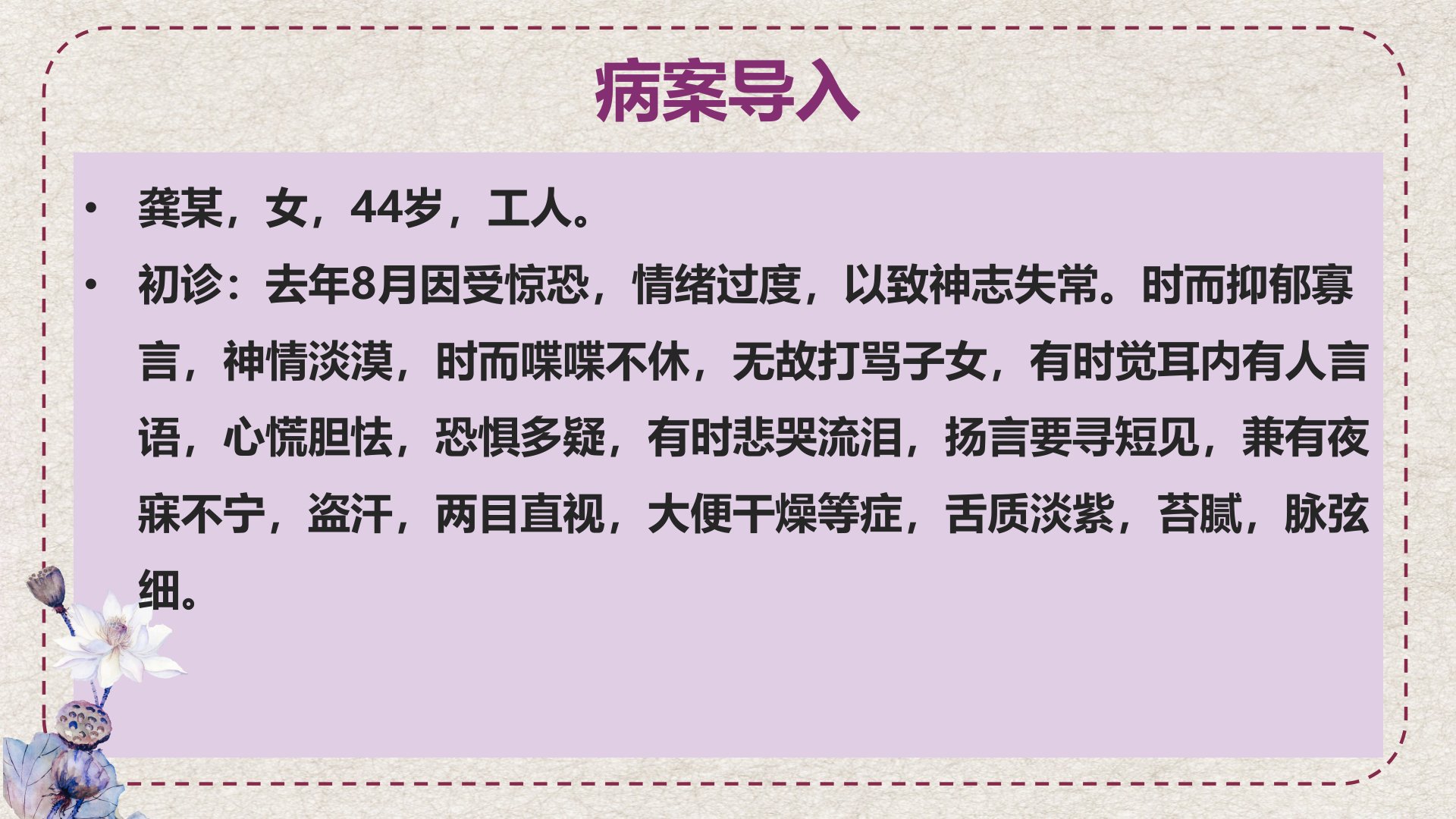 癫狂病案导入龚某,女,44岁,工人。初诊:去年8月因受惊恐,情绪过度,以致神志失常。时而抑郁寡言,神情淡漠,时而喋喋不休,无故打骂子女,有时觉耳内有人言语,心慌胆怯,恐惧多疑,有时悲哭流泪,扬言要寻短见,兼有夜寐不宁,盗汗,两目直视,大便干燥等症,舌质淡紫,苔腻,脉弦细。癫狂是以精神失常为主症的疾病。分为癫证和狂证。癫证以精神抑郁、表情淡漠、沉默呆钝、语无伦次、静而少动为特征;狂证以精神亢奋、狂躁刚暴、喧扰不宁、毁物打骂、动而多怒为特征。二者在临床上症状并存,相互转化,不能截然分开,故以癫狂并称。西医学精神分裂症、躁狂抑郁症、情感障碍中的抑郁症及某些精神性疾病等以癫狂为主要表现者,可参照本节辨...