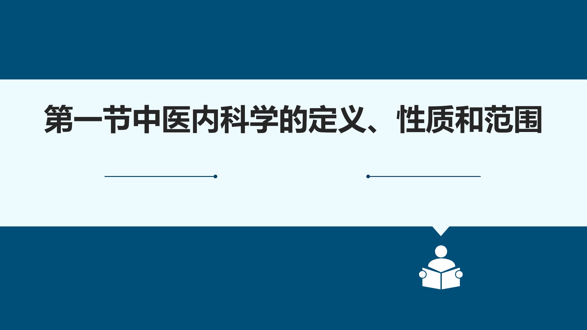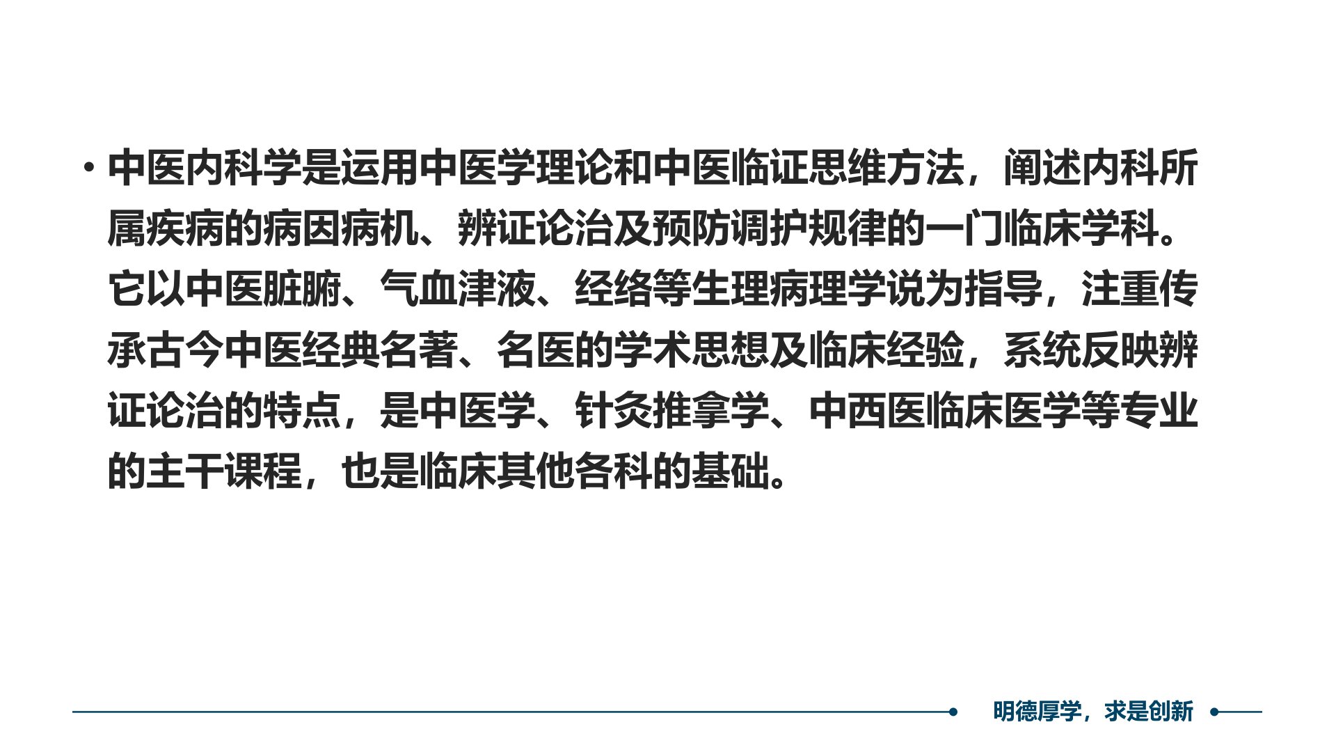 第一章导言第一节中医内科学的定义、性质和范围中医内科学是运用中医学理论和中医临证思维方法,阐述内科所属疾病的病因病机、辨证论治及预防调护规律的一门临床学科。它以中医脏腑、气血津液、经络等生理病理学说为指导,注重传承古今中医经典名著、名医的学术思想及临床经验,系统反映辨证论治的特点,是中医学、针灸推拿学、中西医临床医学等专业的主干课程,也是临床其他各科的基础。中医内科学是中医基础理论联系临床各学科的桥梁,具有承上启下的作用。基础理论知识只有经过内科学的进一步讲授和临床实习,才能被深入理解和掌握;临床各学科则必须以内科学作基础,才能更好地熟悉本学科的特点和技能,从而更灵活地运用于临床,这就是内科学...