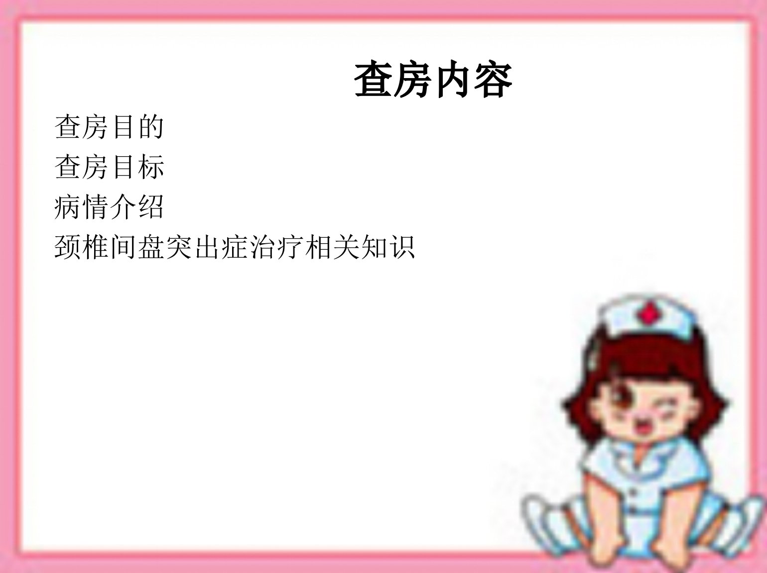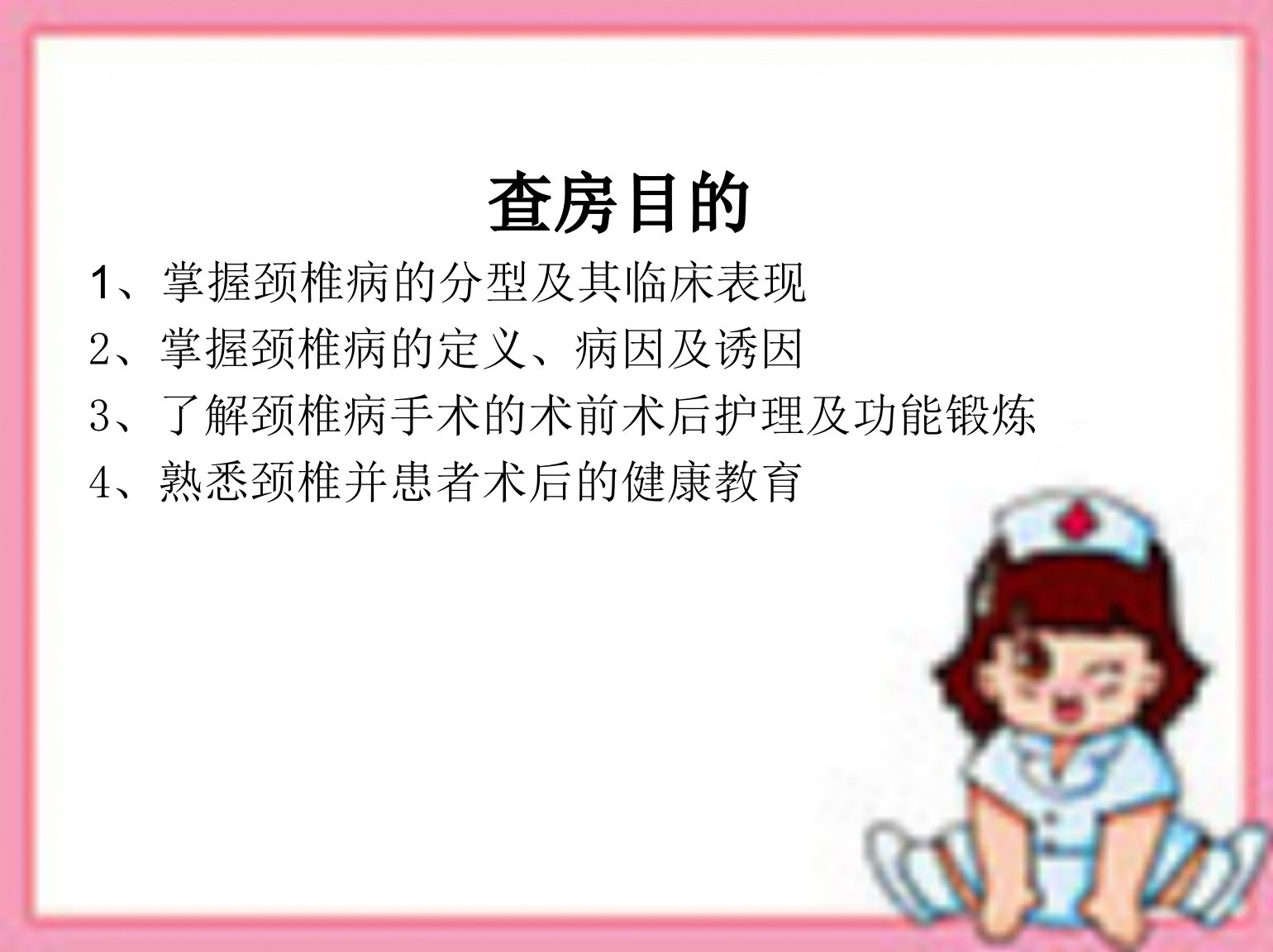 本次查房主查人梁莹莹查房目的为掌握颈椎病的分型、临床表现、定义、病因、诱因了解手术护理及功能锻炼熟悉术后健康教育。查房目标依护士层级设定包括颈椎病概述、肌力评定、术后护理、并发症处理、康复指导及预防等内容。患者王光涛76岁男性因颈部不适伴四肢麻木无力、上肢放射痛10年加重4个月入院诊断为颈34椎间盘突出。2016年5月11日患者在全麻下行颈椎间盘突出后路单边开窗减压钢板内固定术术后生命体征平稳。查房介绍了颈椎的解剖知识指出颈椎病是由于颈椎间盘退行性变等因素刺激或压迫神经根、脊髓等引起。常见原因包括年龄、劳损、不良姿势、风寒湿因素。疾病分型有神经根型、交感型、脊髓型、椎动脉型等。治疗方法有牵引、颈托固定、中医疗法、运动疗法、理疗、推拿按摩和手术等。肌力评定分05级。围手术期护理包括术前心理护理、评估、呼吸道管理等术后注意搬运、翻身、观察面色呼吸、伤口出血等情况加强功能锻炼做好并发症护理。同时介绍了术前术后护理问题及相应护理措施。最后强调了颈椎病的出院指导、治疗误区及预防保健操。