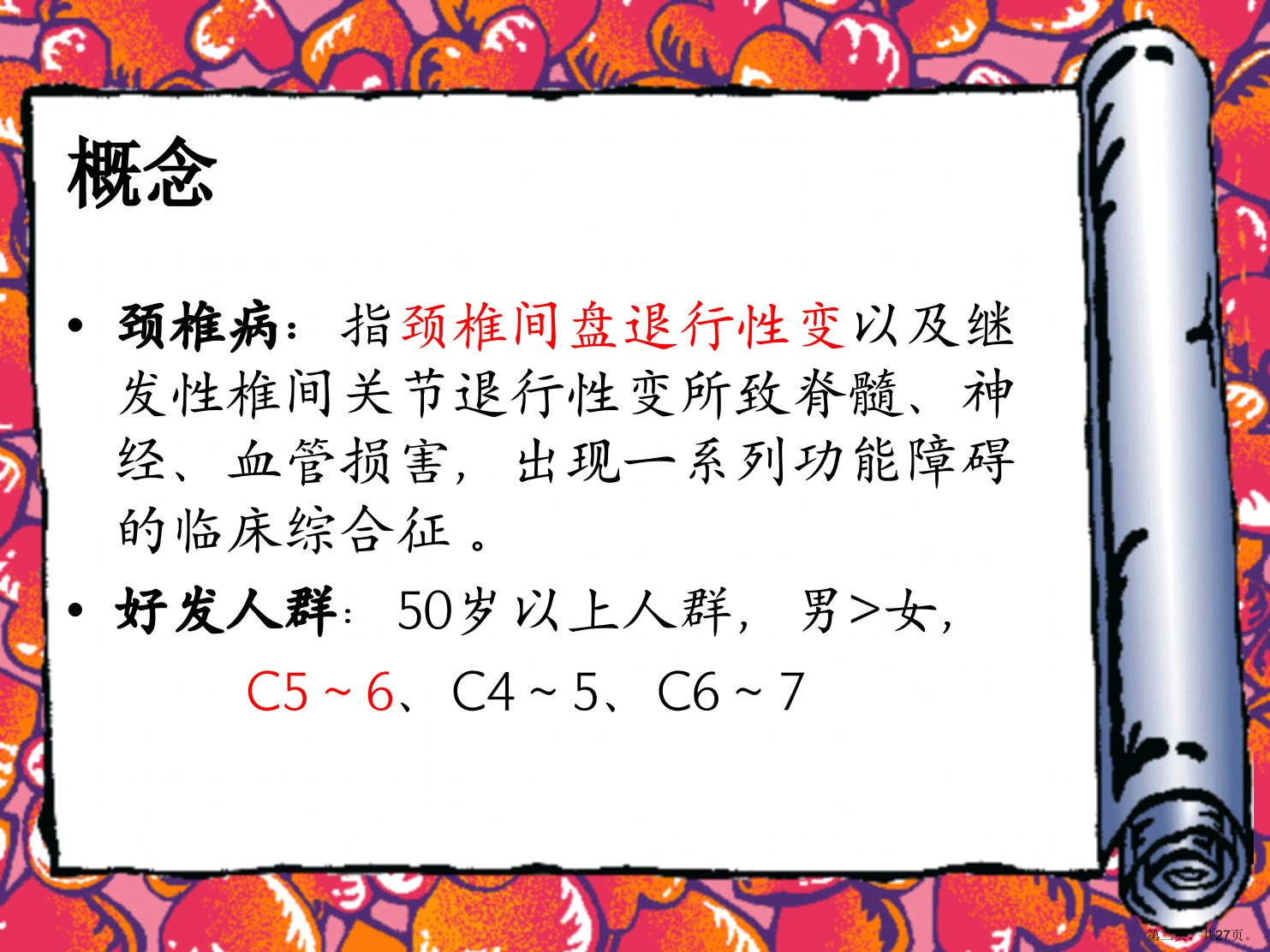 颈椎病护理查房摘要颈椎病指颈椎间盘退行性变及继发性椎间关节退变致脊髓、神经、血管损害出现功能障碍的临床综合征好发于50岁以上人群。其病因主要是颈椎间盘退行性变颈椎先天性或发育性椎管狭窄以及慢性或急性损伤。临床分型包括交感神经型、脊髓型、椎动脉型和神经根型症状各不相同如神经根型表现为颈部疼痛僵硬、上肢麻木等;椎动脉型有眩晕、头痛等;脊髓型手部发麻、下肢无力;交感神经型有偏头痛、视物模糊等症状。治疗分非手术和手术两类前者包括牵引、卧床休息等后者有前路、前外侧路、后路手术。病例中张熙玫患者因双上肢麻木等入院经颈椎MRI检查后予颈部牵引等治疗症状改善。护理方面需促进病人感觉和运动功能恢复做好健康教育包括保持正确姿势、加强功能锻炼、心理调节等出院后也需注意相关事项。此外还介绍了可改善颈部状况的自我康复操。