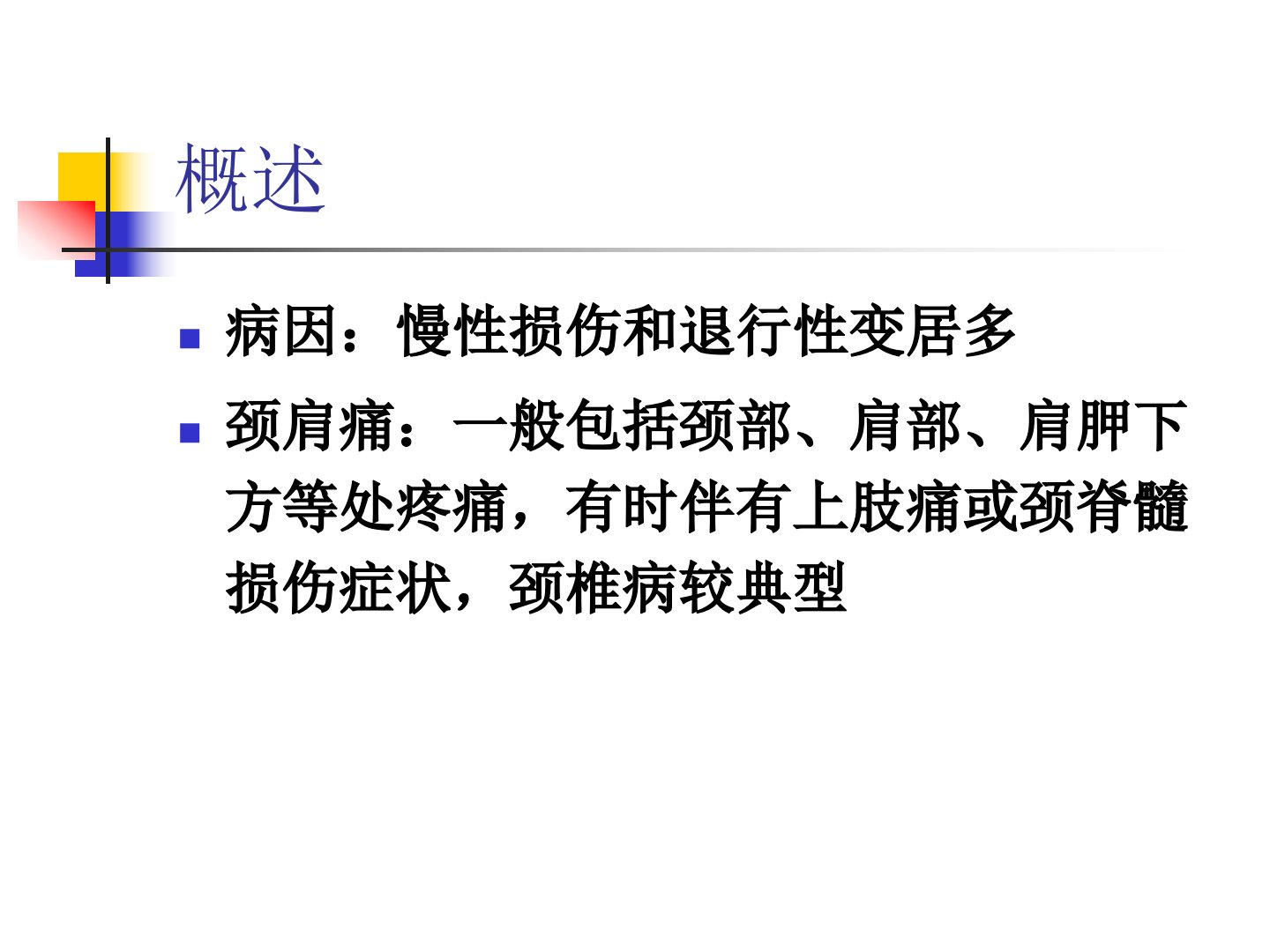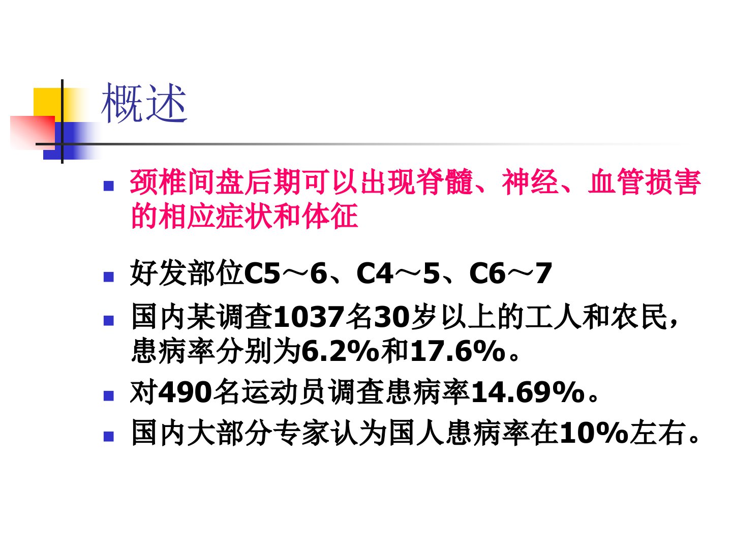 颈椎病多由慢性损伤、退行性变引发好发于C56、C45、C67等部位患病率国内调查约10症状包括颈肩痛、上肢痛或颈脊髓损伤等。病因包括颈椎间盘退行性变致关节囊、韧带松弛刺激受压相邻脊髓、神经、血管;急性或慢性损伤诱发或加重症状;先天颈椎管狭窄轻微退行性变即可出现症状。颈椎病分为神经根型、脊髓型、椎动脉型、交感神经型其中神经根型最常见脊髓型症状最严重。治疗包括非手术和手术疗法前者原则是祛除压迫因素、消炎止痛、恢复颈椎稳定性后者适用于诊断明确、非手术疗法无效、反复发作、压迫症状进行性加重的患者尤其是脊髓型颈椎病者。术后需保持有效气体交换观察处理并发症促进病人感觉和运动功能恢复。腰腿痛常见椎间盘突出症较典型病因包括腰椎间盘突出和腰椎管狭窄多见于中年人。治疗包括非手术、手术和经皮穿刺髓核摘除术。腰腿痛病人护理包括术前术后护理如平卧硬板床、功能锻炼、生活护理等。