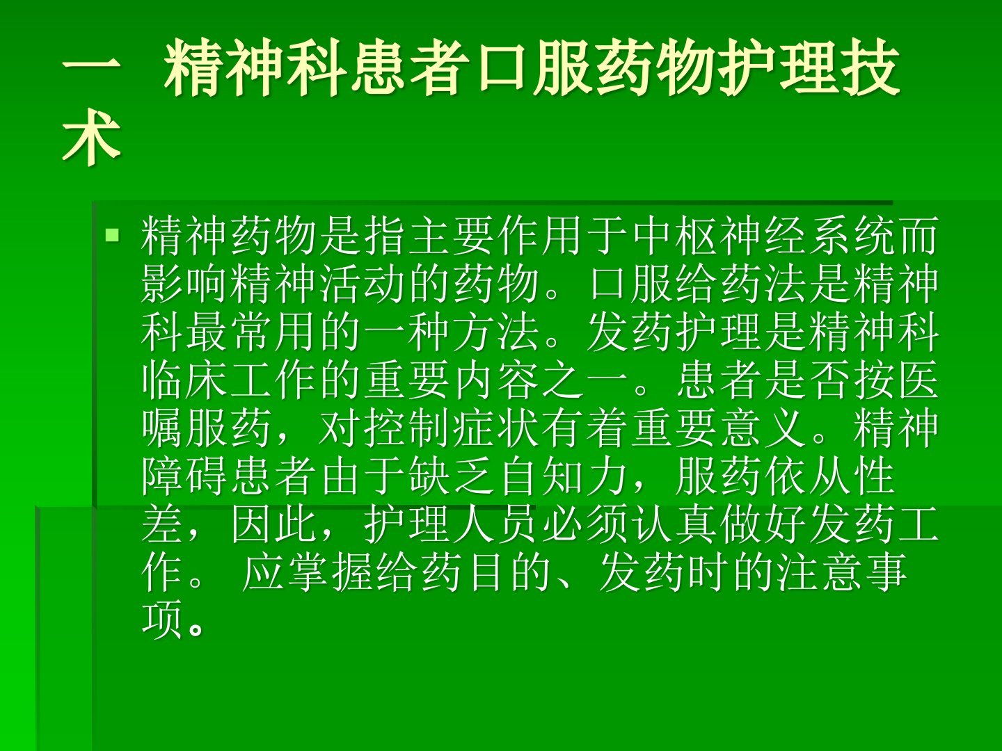 精神药物治疗护理技术一精神科患者口服药物护理技术精神药物是指主要作用于中枢神经系统而影响精神活动的药物。口服给药法是精神科最常用的一种方法。发药护理是精神科临床工作的重要内容之一。患者是否按医嘱服药,对控制症状有着重要意义。精神障碍患者由于缺乏自知力,服药依从性差,因此,护理人员必须认真做好发药工作。应掌握给药目的、发药时的注意事项。1目的(1)保证患者准确无误地服下药物。(2)无服药意外事故发生。(3)提高患者及家属对药物治疗的认识和服药依从性。2注意事项(1)给药前要心中有数;用药史、治疗依从性等。(2)备药时要严格查对:做好三查八对;(3)发药时要准确无误注意安全;最少两人发药,同时核对...