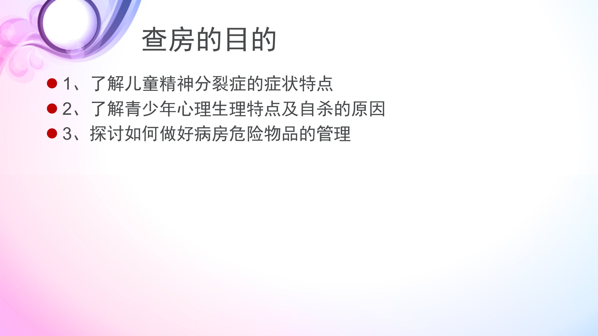 精神科护理查房案例分析2病区护理查房2018年7月查房的目的1、了解儿童精神分裂症的症状特点2、了解青少年心理生理特点及自杀的原因3、探讨如何做好病房危险物品的管理一般资料患者姓名:吴某某床号:12床年龄:14岁职业:初中学生病历报告人:患者本人及患者父母可靠程度:可靠主管医生:张医生责任护士:李丽莎护理级别:一级护理饮食:普食诊断:精神分裂症入院时间:2018年6月18日入院主诉复起易激惹,行为冲动3天,总病程1年。入院原因与经过2017年5月逐渐出现精神异常,与双胞胎哥哥的表现有一定的关联,哥哥有什么表现,患者随后也会出现。主要表现行为异常,无故紧张害怕,无原因的肩颈部抽搐,而且称自己控制...