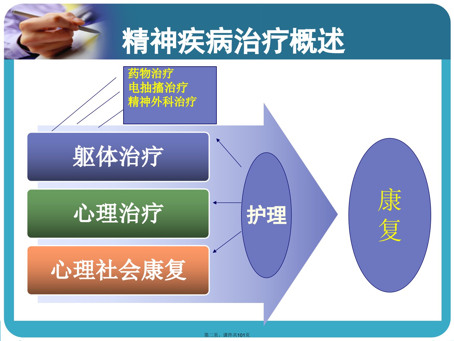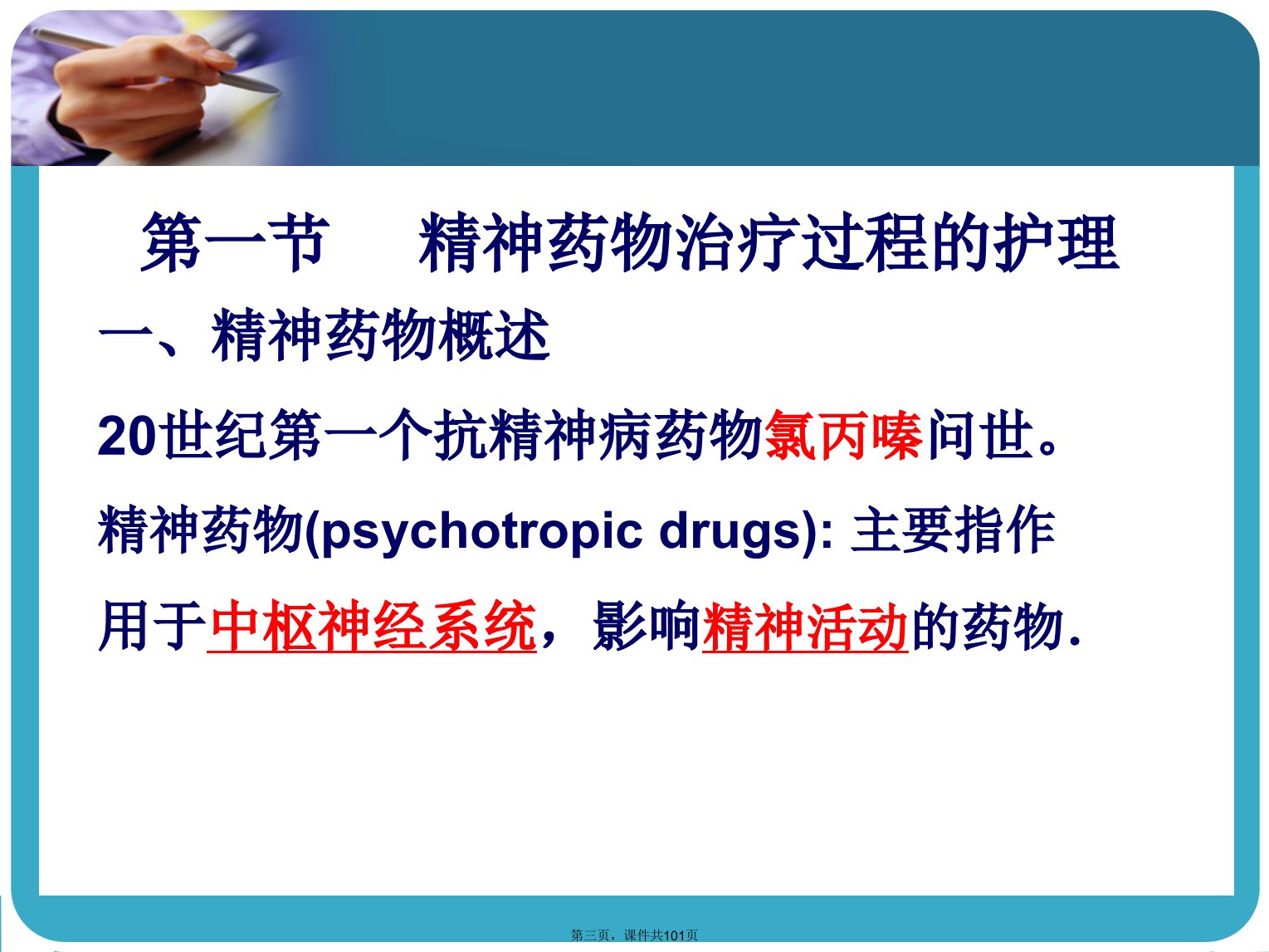 精神疾病治疗过程的护理第一页,课件共101页精神疾病治疗概述药物治疗电抽搐治疗精神外科治疗第二页,课件共101页第一节精神药物治疗过程的护理一、精神药物概述20世纪第一个抗精神病药物氯丙嗪问世。精神药物(psychotropicdrugs):主要指作用于中枢神经系统,影响精神活动的药物.第三页,课件共101页精神病药物分类:抗精神病药物(antipsychotics)抗抑郁药物(antidepressants)抗躁狂药物(antimanics)抗焦虑药物(anxiolytics)第四页,课件共101页抗精神病药物定义抗精神病药物(antipsychoticdrugs)是主要用于治疗精神分裂症和...