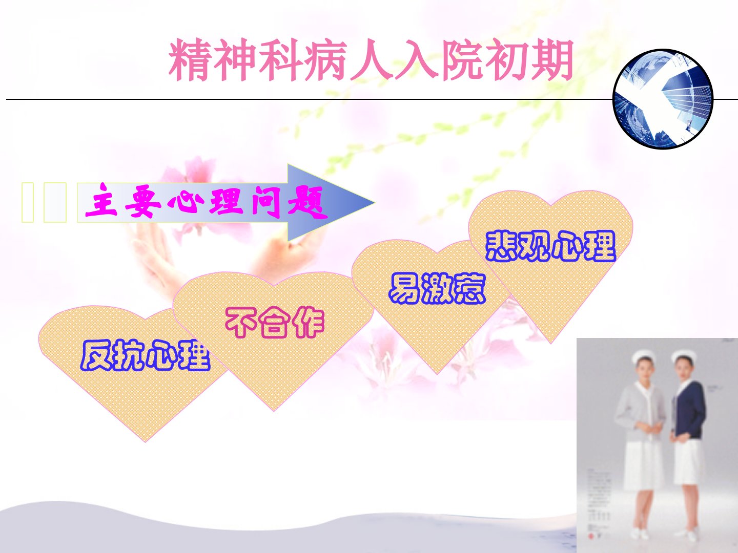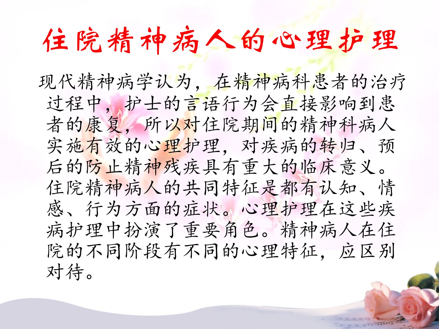 住院精神病人的心理护理对疾病转归和预后至关重要。住院精神病人普遍存在认知、情感和行为方面的症状且在不同阶段表现出不同心理特征。入院初期病人常出现反抗、不合作、易激惹和悲观等心理问题。护理对策包括建立良好护患关系理解病人感受因势利导进行恰当暗示转移病人注意力以及进行心理安慰和正确指导。有效治疗期病人思维过程可能改变、出现感知障碍、产生疑虑和抑郁心理。此时应通过精神卫生知识学习、现身说教、重建健康心理、提供心理支持和必要时告知医生使用对症药物等方式进行护理。康复期病人可能出现自卑、病人角色强化、意志消沉和盲目乐观等心理问题。护理应正确理解疏导鼓励病人保持正常生活并做好病人家属的健康教育树立病人健康向上的心理。