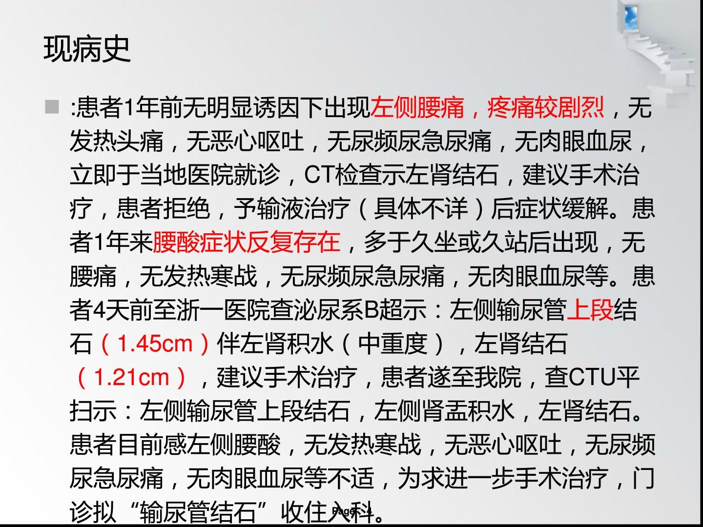 输尿管结石患者的护理查房摘要本次护理查房聚焦输尿管结石患者。输尿管结石作为泌尿系统常见病症给患者带来极大痛苦严重影响生活质量。护理过程中密切关注患者症状变化至关重要。需留意患者是否出现肾绞痛、血尿等症状疼痛的部位、性质及程度以便及时评估病情并采取相应措施。同时要关注患者的排尿情况包括尿量、颜色及有无排尿困难等。在生活护理方面鼓励患者增加饮水量促进结石排出。指导患者进行适度运动如跳绳、上下楼梯等有助于结石下移。饮食护理上根据结石成分调整饮食结构减少高钙、高草酸等食物摄入。心理护理也不容忽视患者常因疼痛和担忧预后产生焦虑情绪护士需耐心倾听给予心理支持增强其战胜疾病的信心。